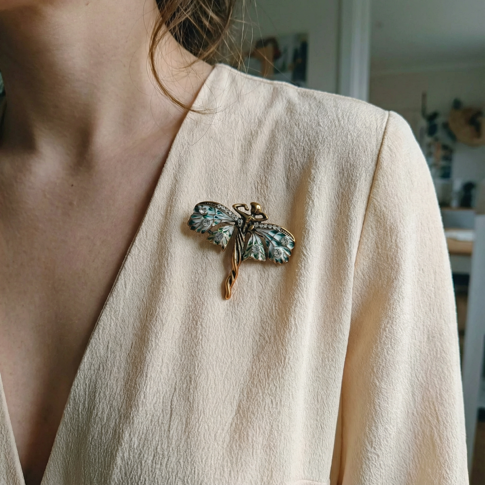 This brooch features a stunning Art Nouveau-style fairy, her wings outstretched in a poised, elegant dance. Cast in a warm antique gold-tone metal, the figure is framed by butterfly-like wings in swirling shades of blue, green, and ivory enamel. Each wing is adorned with sparkling rhinestones that catch the light like morning dew.