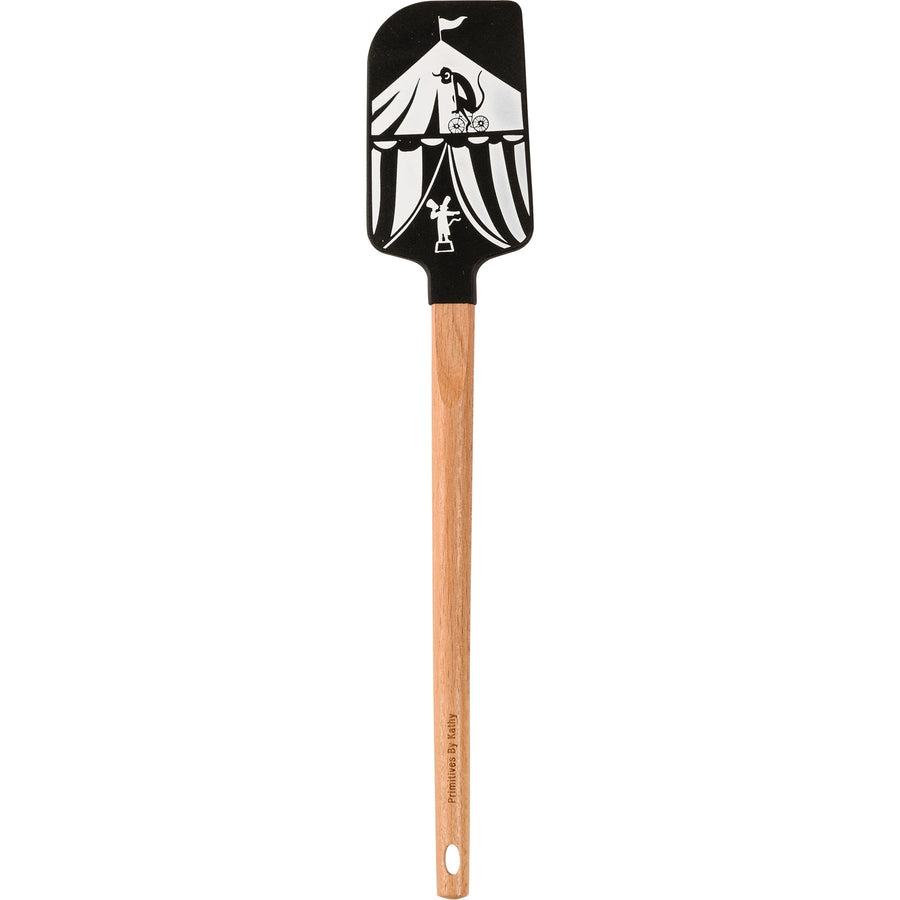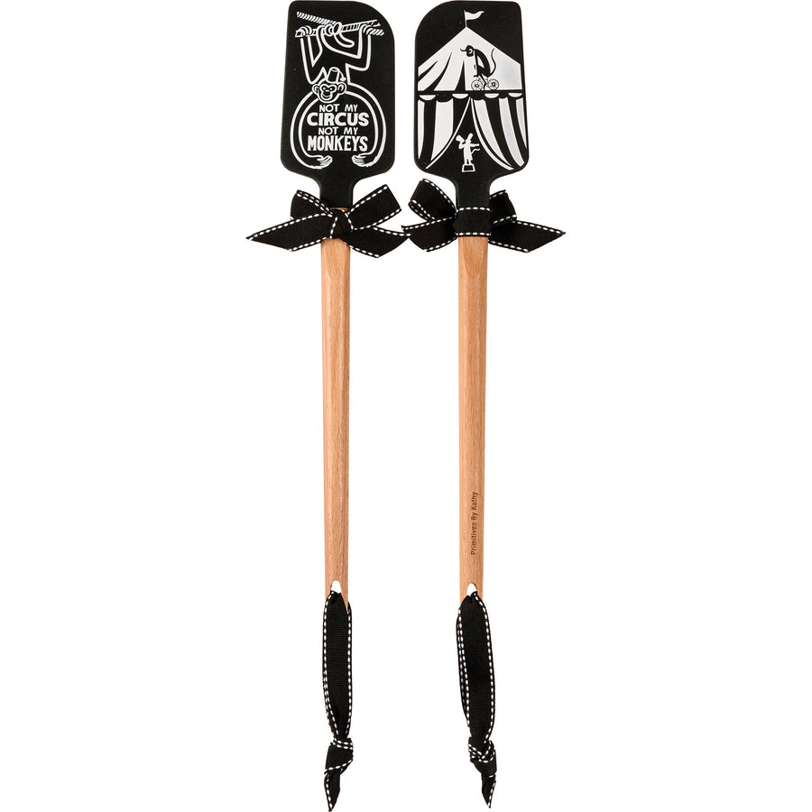 A double-sided silicone spatula featuring a circus monkey design with "Not My Circus Not My Monkeys" sentiment on one side, and circus tent and circus monkey designs on the other side. Our Not My Circus Not My Monkeys spatula features a logo engraved into wooden handle for added interest and a decorative bow and ribbon for hanging.