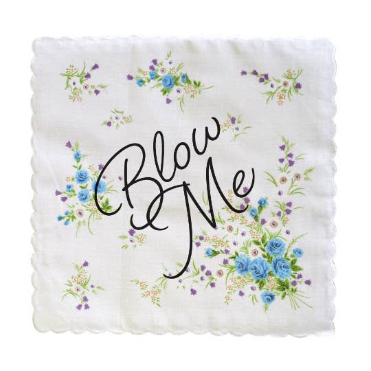 This pretty floral retro handkerchief reads "Blow Me" in script. We're talking about your nose, right? We blow our noses with handkerchiefs ... but also, you know ...