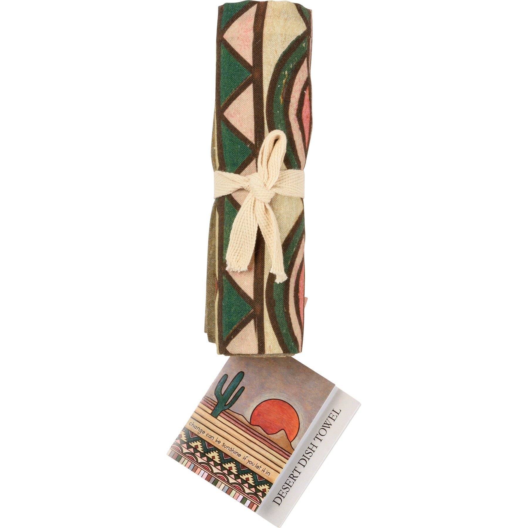 A cotton kitchen towel featuring "Change Can Be Sunshine If You Let It In." sentiment and muted woodburned desert designs.