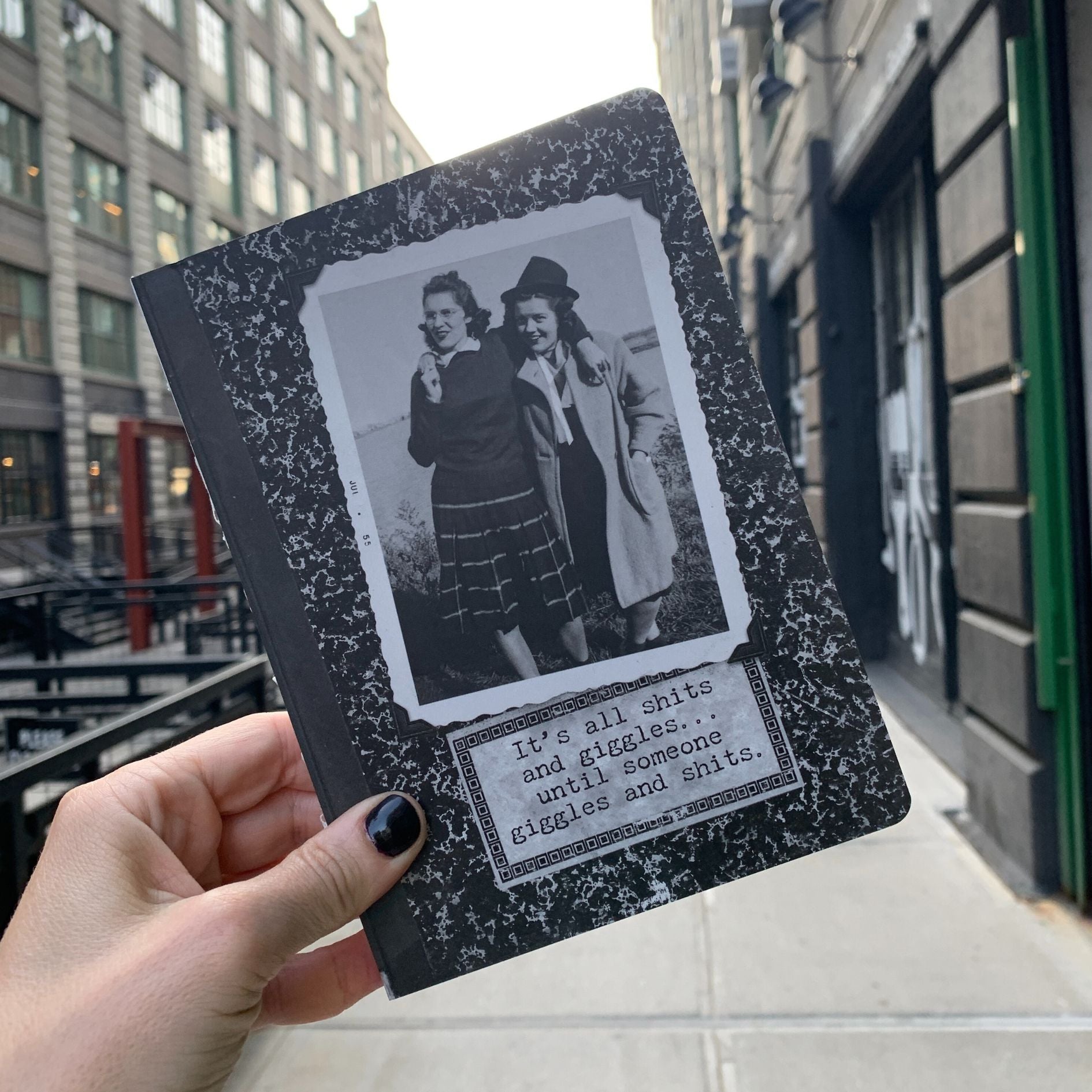A double-sided journal featuring vintage photography and "It's All Shits And Giggles… Until Someone Giggles And Shits." sentiment. sentiment.