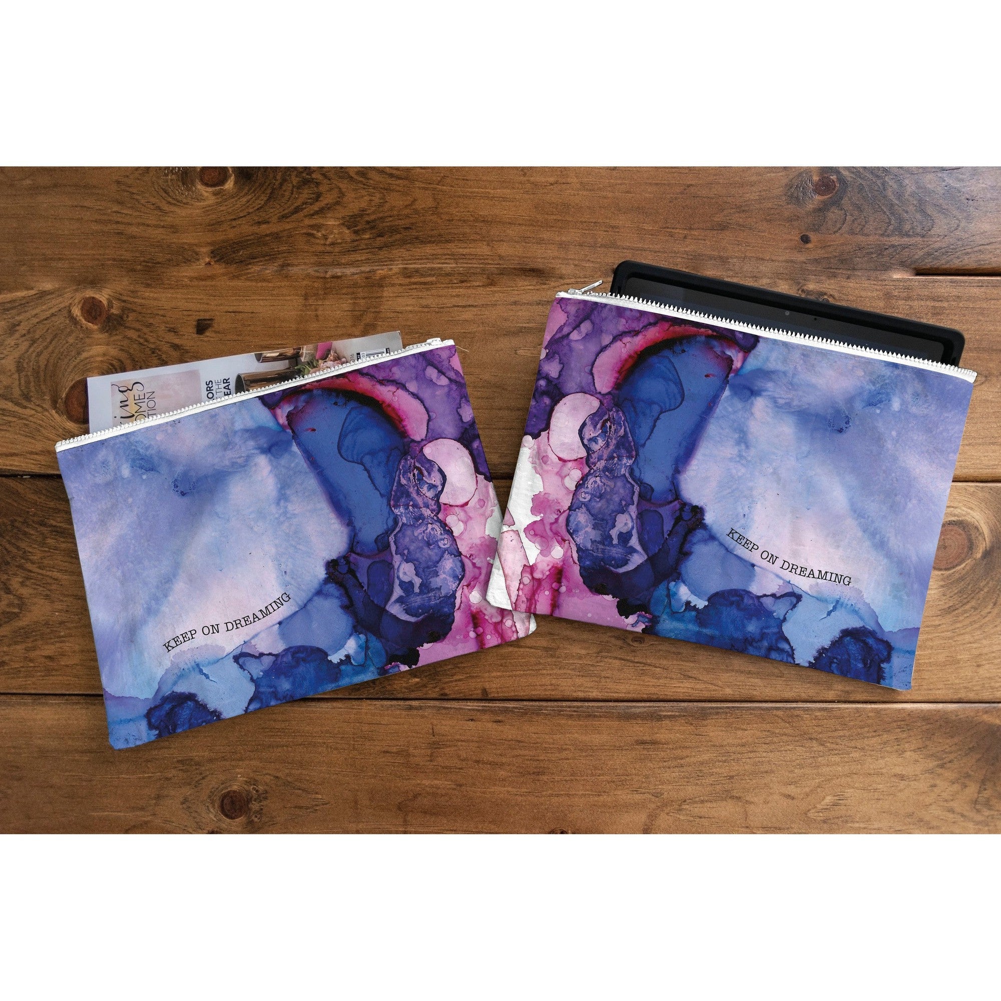 Featuring a vibrant watercolor design and a "Keep On Dreaming" sentiment, this Jumbo Pouch by Primitives by Kathy is made of colorful post-consumer material, measuring 14.25" x 10". The double-sided zipper folder is perfect for storing 8.5 x 11 papers, magazines, folders, and more, with a top zip closure for added security. Crafted by the talented artist, Pat, known for his unique and powerful designs inspired by his artistic family background.
