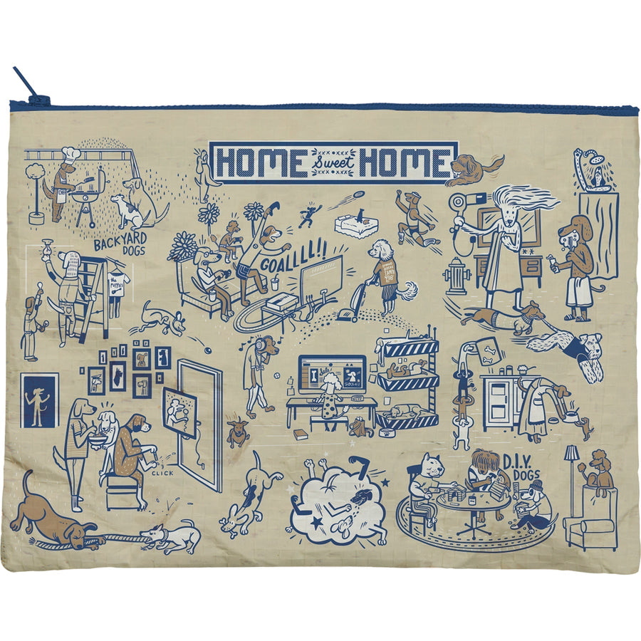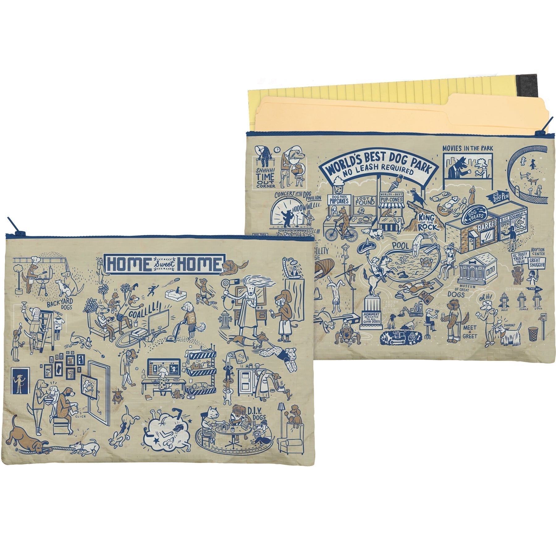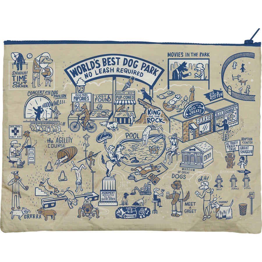 Made of post-consumer material, this zipper folder features all-over dog-themed designs with front "World's Best Dog Park No Leash Required" sentiment and "Home Sweet Home" sentiment on reverse side with a top zip closure.