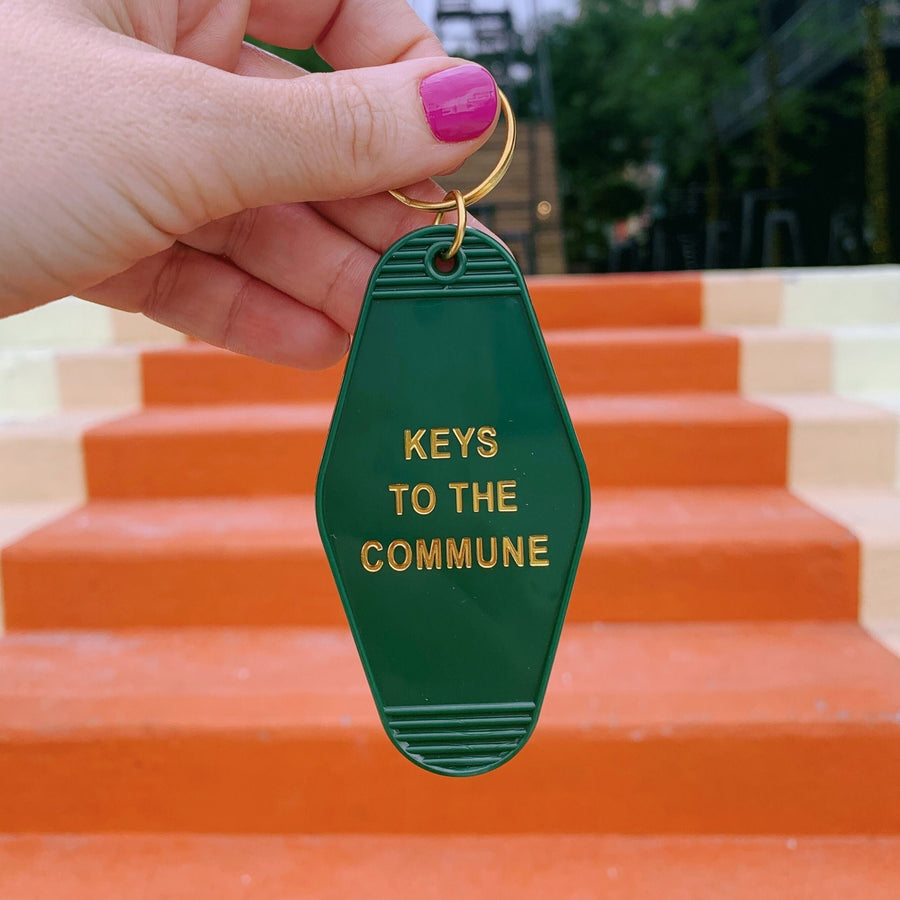 This keychain reads: KEYS TO THE COMMUNE in gold