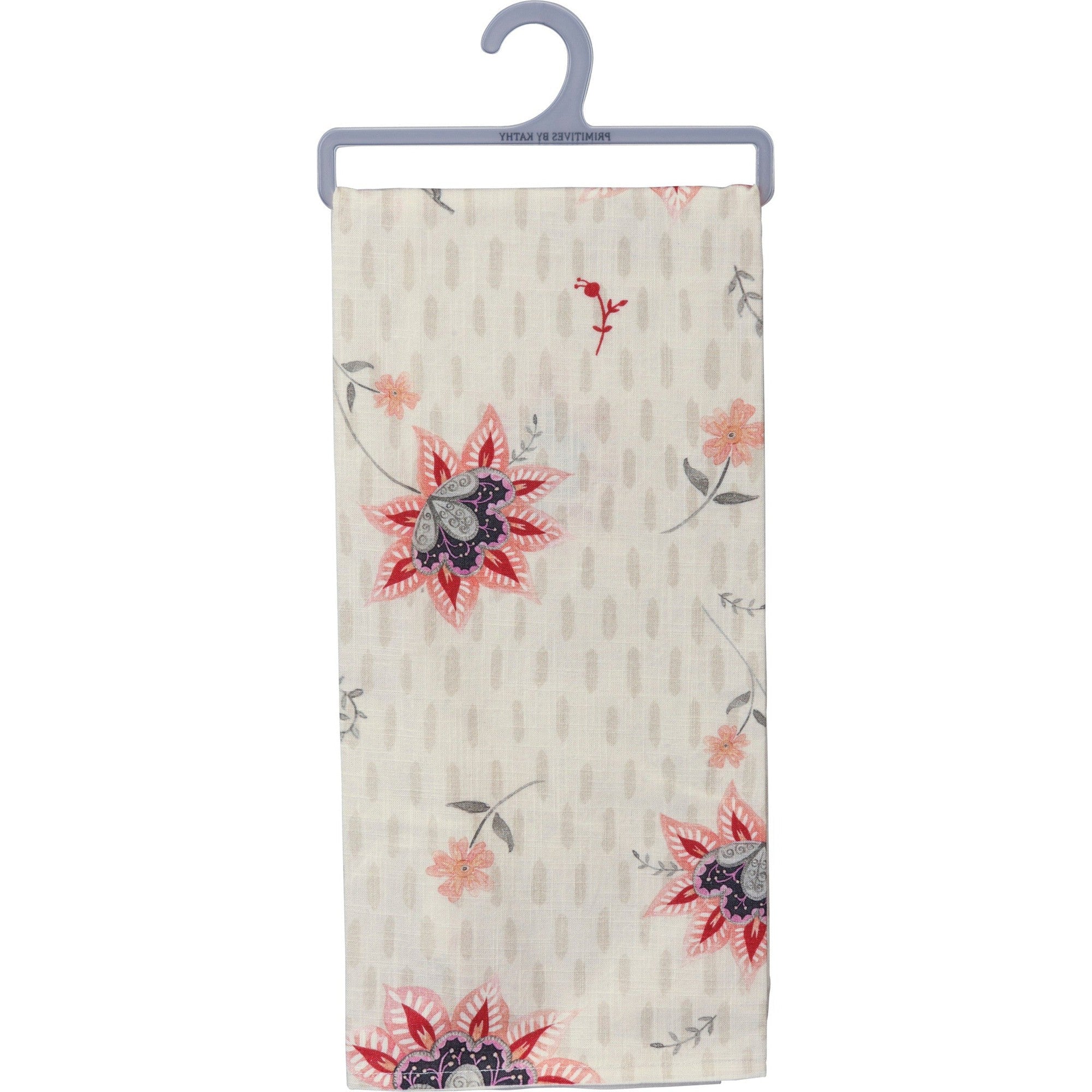 A cotton dish towel featuring a "Love Makes A House A Home" sentiment, digitally printed designs, and a vibrant red, neutral, and pink palette. Machine-washable.