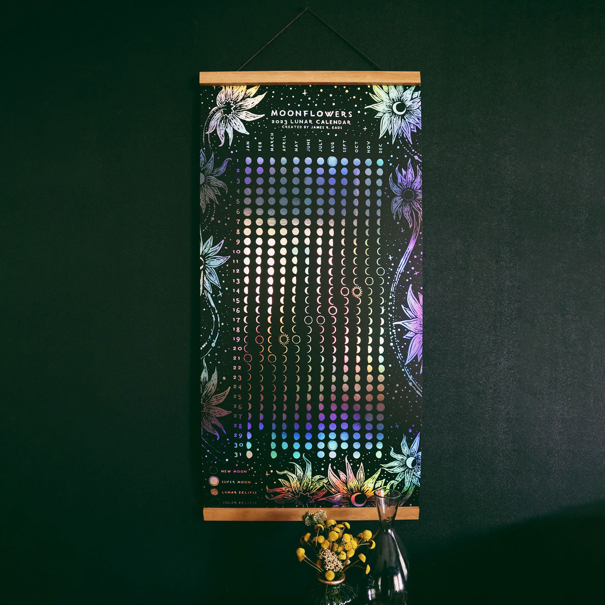 The Moonflowers 2025 Lunar Calendar is a 12" x 24" screenprint on either rainbow foil paper or matte white paper. This calendar includes the lunar phases for the entire year as well as Super Moons, Lunar Eclipses, and Solar Eclipses.