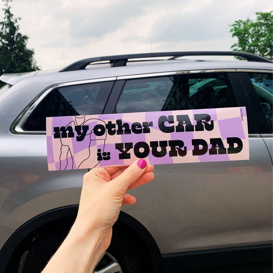 Add a touch of humor to your car with the "My Other Car is Your Dad" bumper sticker that measures 11" x 3". This glossy finish sticker is perfect for bumpers, car windows, laptops, and more, making it a fun and unique gift idea for the jokester in your life.