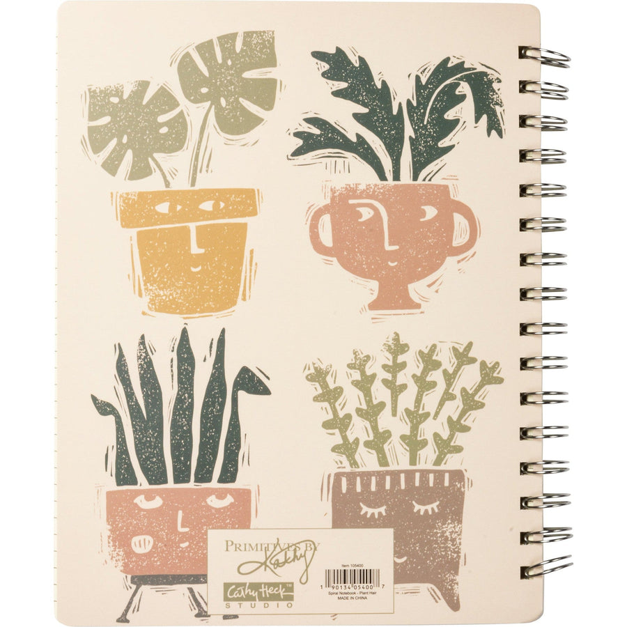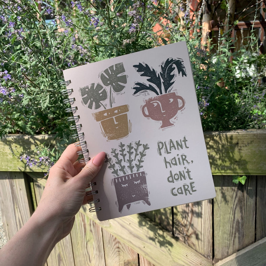A spiral notebook featuring a "Plant Hair, Don't Care" sentiment with double-sided block print potted plant designs. Contains 120 lined pages.