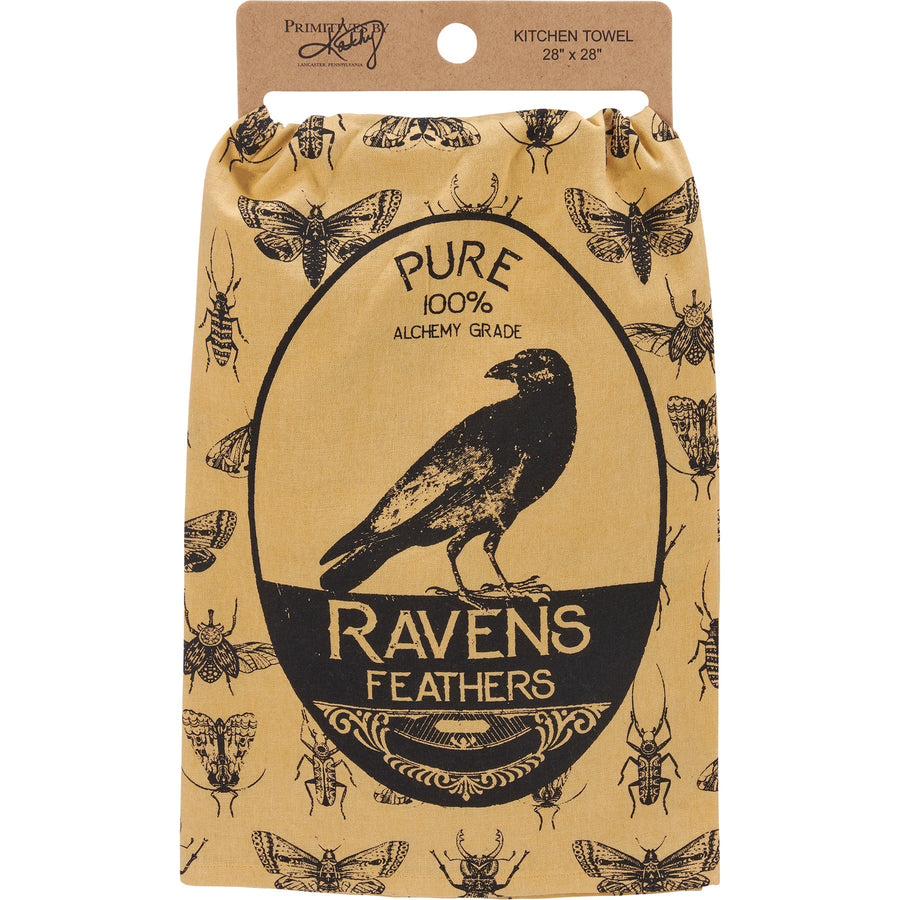 A cotton kitchen towel fromΒ displaying a rustic design of a logo with a raven that reads "Pure 100% Alchemy Grade - Ravens Feathers" and all-over insect designs behind logo.
