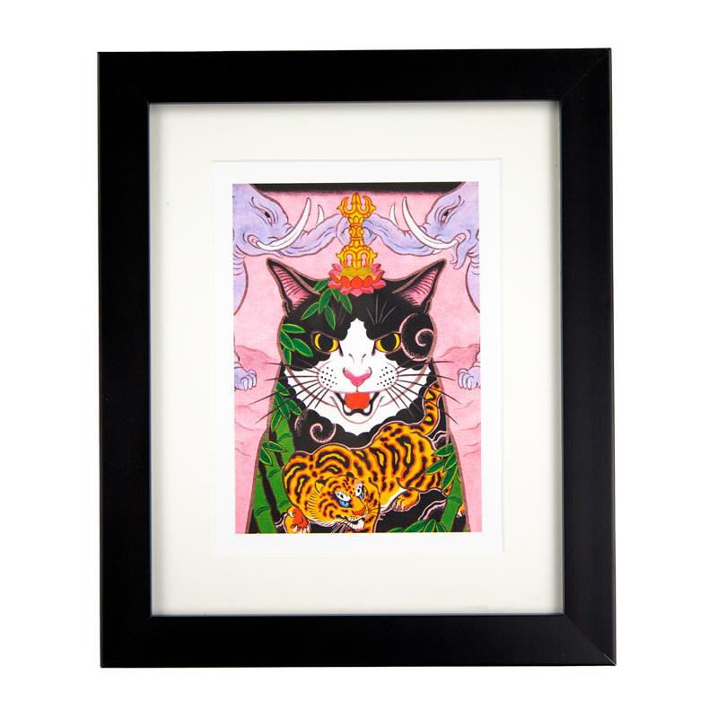 All prints are behind glass with a flat, black wood frame, matting, and hanging hooks.