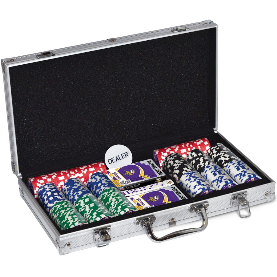 Looking for a great way to support your favorite team on poker night? Well, ante up with MasterPieces officially licensed NFL Minnesota Vikings 300 Piece Casino Style Poker Chips! These heavy 11.5-gram chips are perfect for Texas Hold'EM, Blackjack, card games, and much more. The poker set includes 300 high-quality standard-colored poker chips (11.5g) featuring two unique team designs. 60 White Chips, 60 Red Chips, 60 Blue Chips, 60 Green Chips, and 60 Black Chips. 6 standard-size (16mm) dice featuring your team's logo and colors on each die, 2 decks of playing cards with card-back designs featuring your favorite team's logo. All face cards and jokers have detailed custom team designs. 1 dealer button. Plus, an easy-to-carry sturdy aluminum case has a black velour interior to protect and organize poker chips, playing cards, and dice.