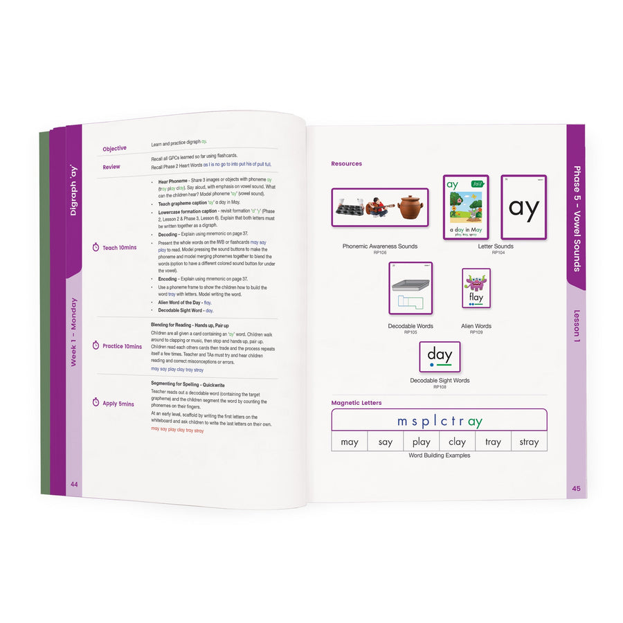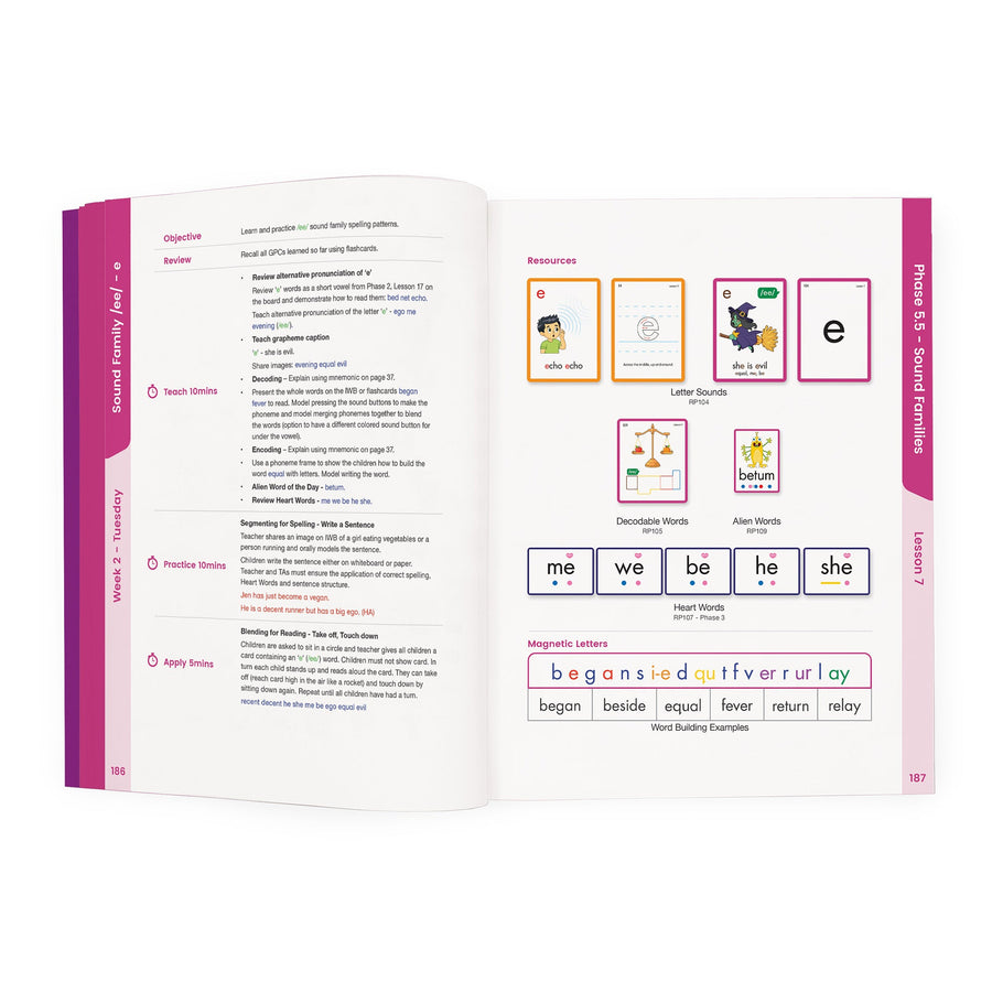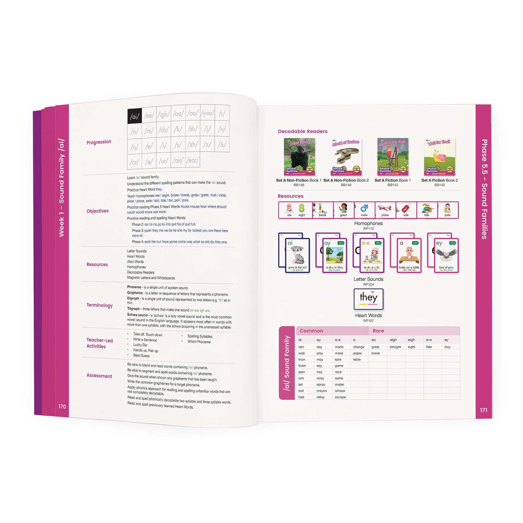 The Planner begins with Phase 5, covering a further 19 graphemes that mainly cover vowel sounds and alternative spellings of these such as the spilt digraph. Throughout the year a significant amount of teaching is dedicated to sound families. Here, the focus is on a common phoneme and the various ways that phoneme can be spelt.