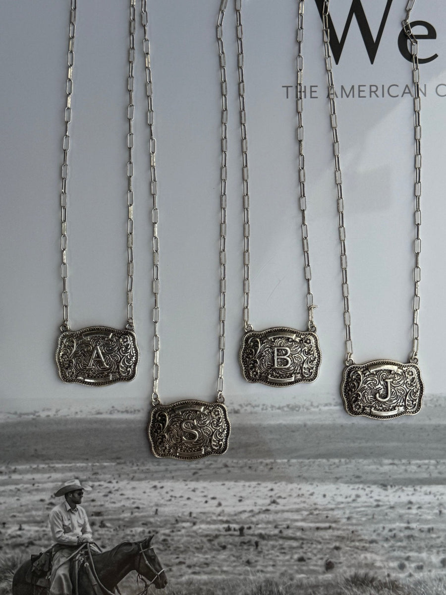 The Belt Buckle Initial Necklace is a dainty nod to rugged roots. Featuring a western-style belt buckle charm in your chosen initial, it blends cowboy grit with personalized charm. Whether you're layering it or letting it shine solo, this necklace says you're the boss—initials and all.
