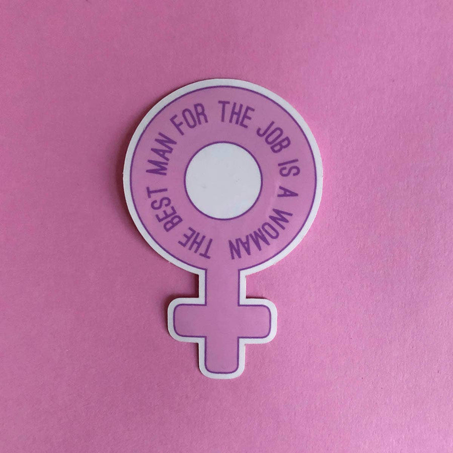 Pink and white sticker says "The Best Man for the Job is a Woman".