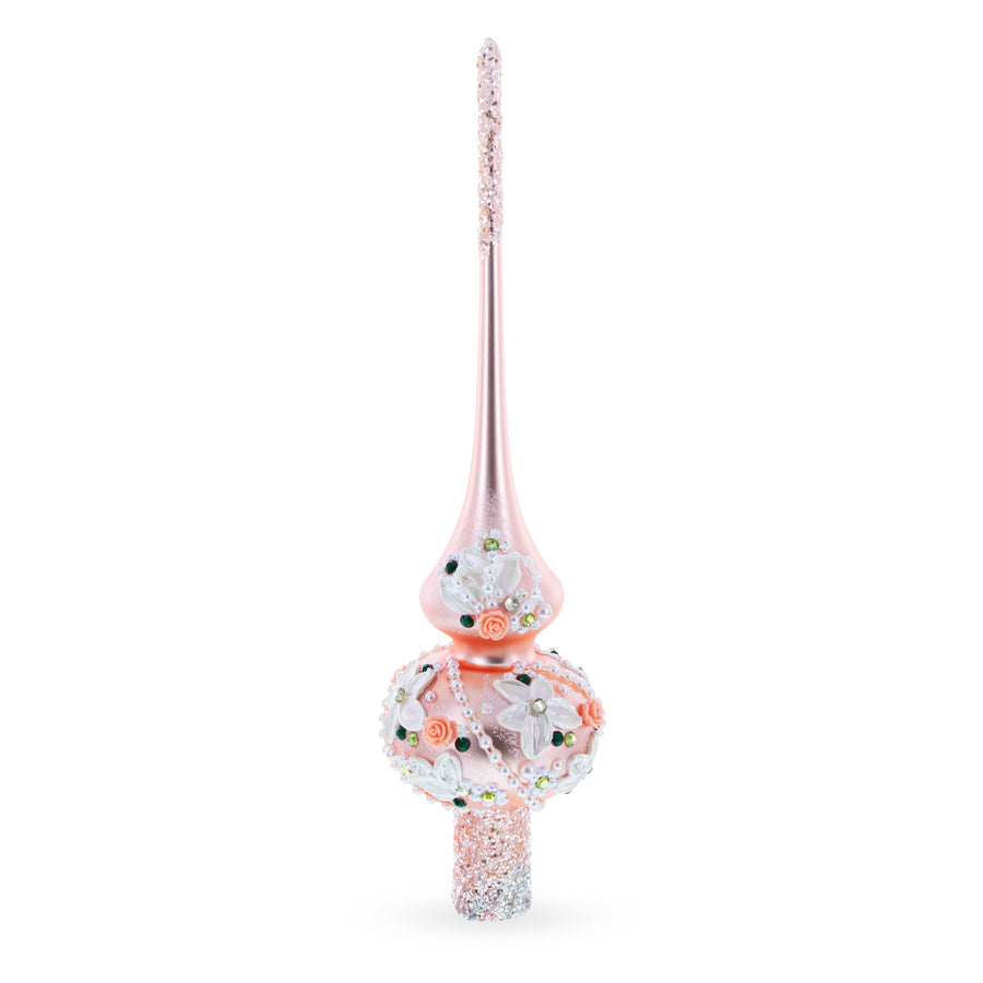 Dimensional Pink Flowers on Metallic Rose Pink Mouth Blown Glass Christmas Tree Topper 11 Inches