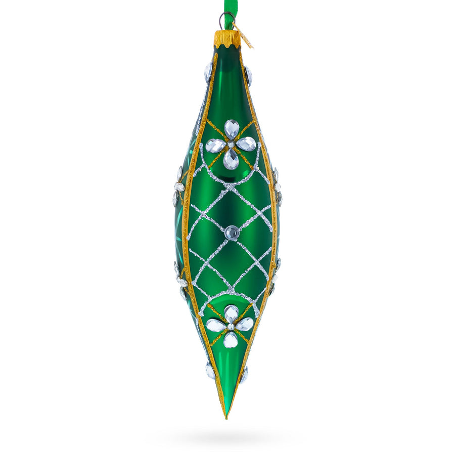 Emerald Jeweled Lattice Elongated Pointed Teardrop Finial Glass Christmas Ornament