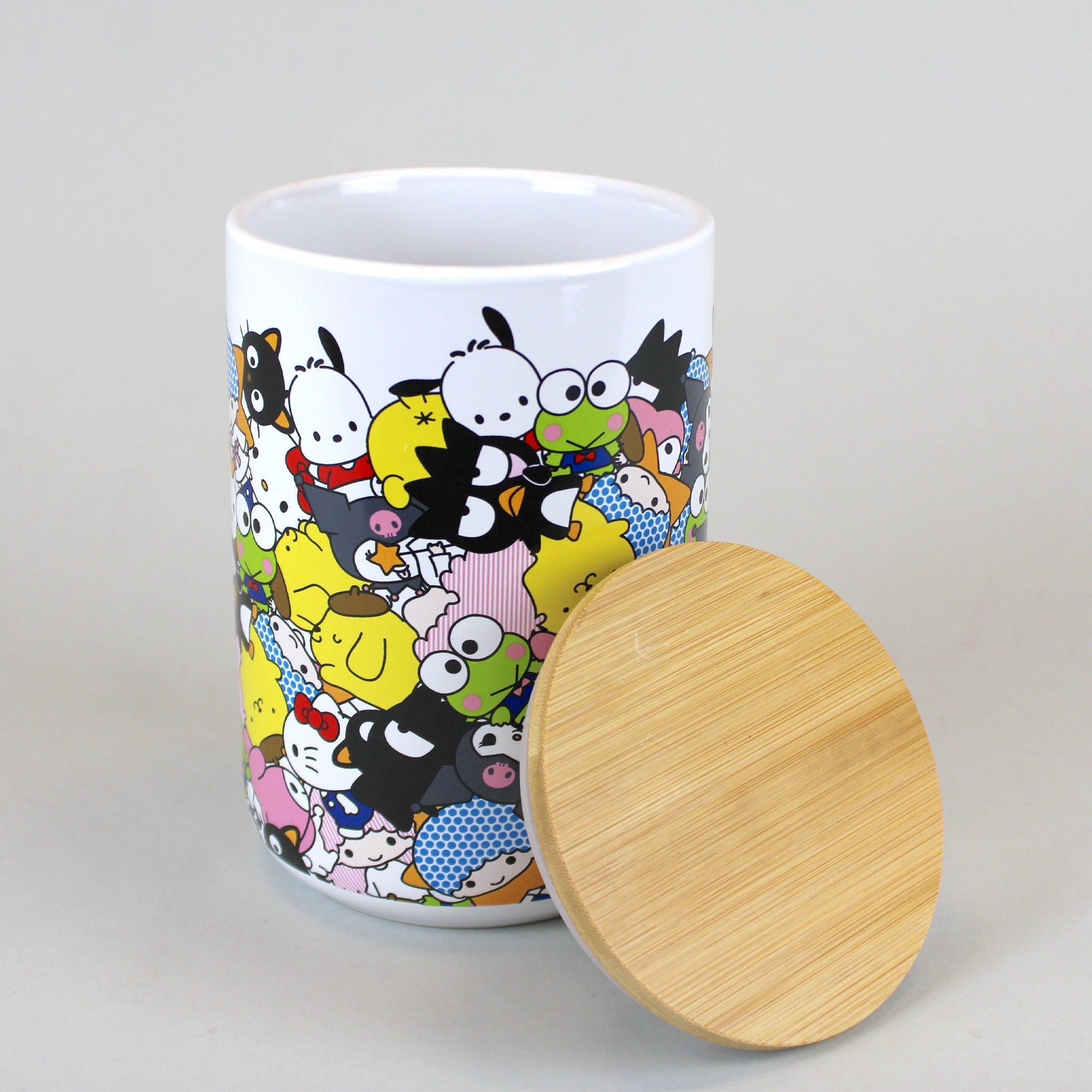 Make sure your cookies stay fresh with this ceramic Hello Ktty & Friends snack jar with a bamboo lid! This 7 inch tall, 4.5 inch diameter jar features an all-over print of Sanrio's iconic characters such as Chococat, Pompompurin, Kuromi & My Melody,  Hangyodon, Pochacco, Keroppi, Pekkle, Cinnamoroll, Tuxedosam, Little Twin Stars, Hello Kitty, and Badtz-Maru. The perfect size for storing snacks or small things, this jar has a removable airtight bamboo lid that'll keep snacks delicious. Constructed from safe and toxin-free material, it's the perfect treat for any Sanrio fan!