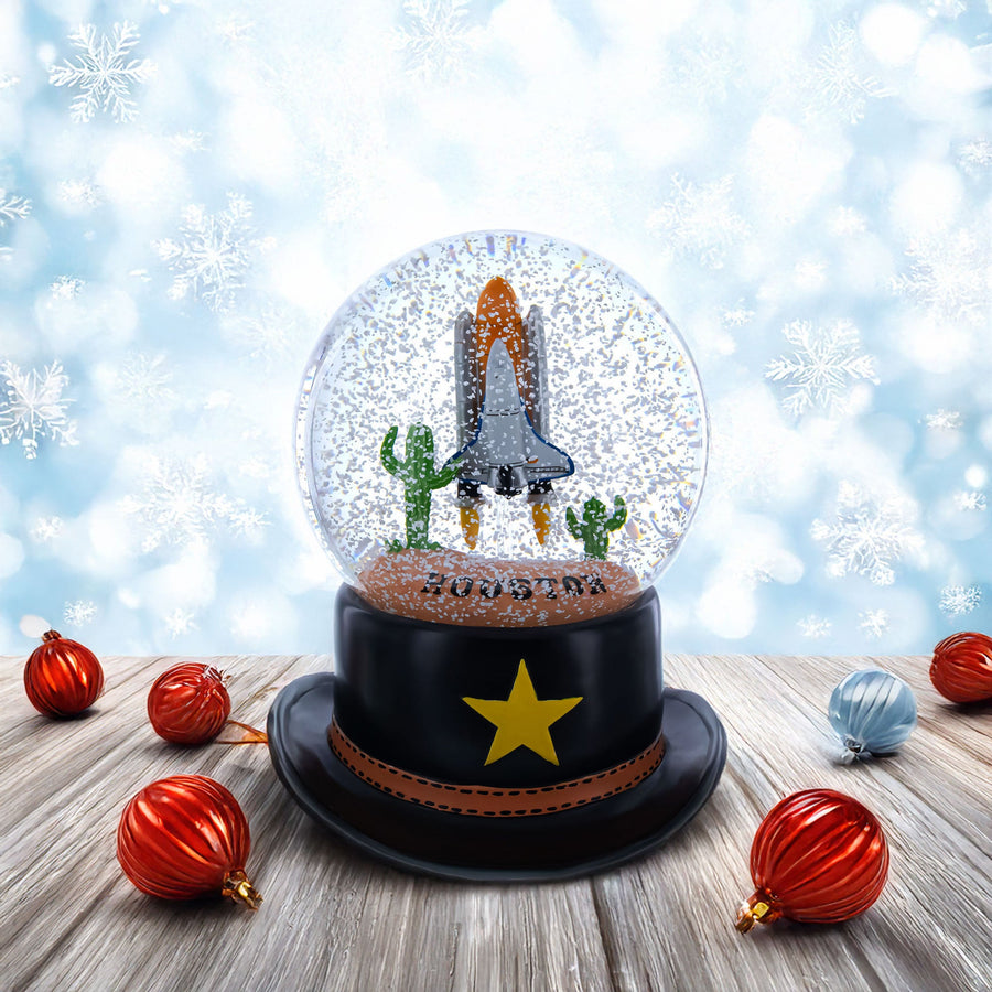 Celebrate the spirit of Houston with this one-of-a-kind snow globe, featuring a space shuttle launching into the sky, surrounded by desert cacti. The base is shaped like a cowboy hat with a sheriff's star, perfectly blending the themes of Texas heritage and space exploration. Shake the globe to create a swirling snowstorm around the shuttle, adding a whimsical touch to this unique keepsake.