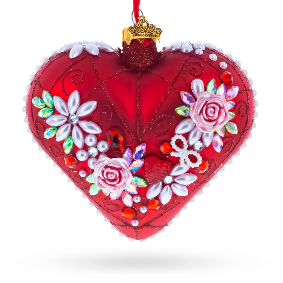 Pearl & Ruby Jeweled Heart Glass Ornament