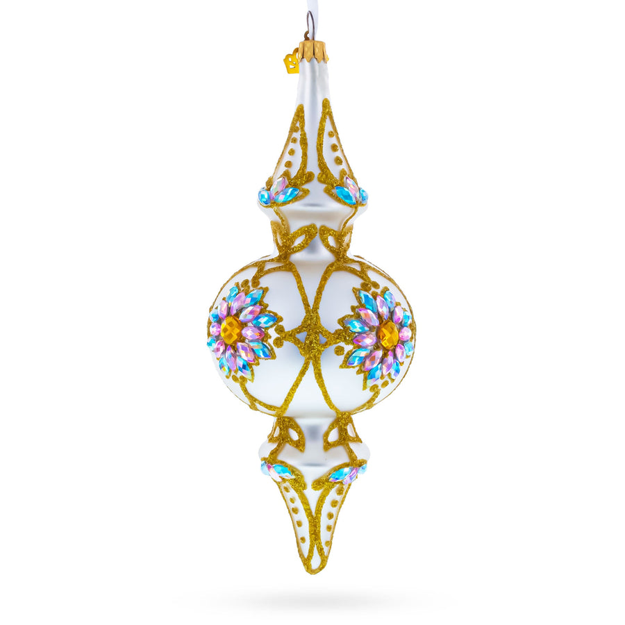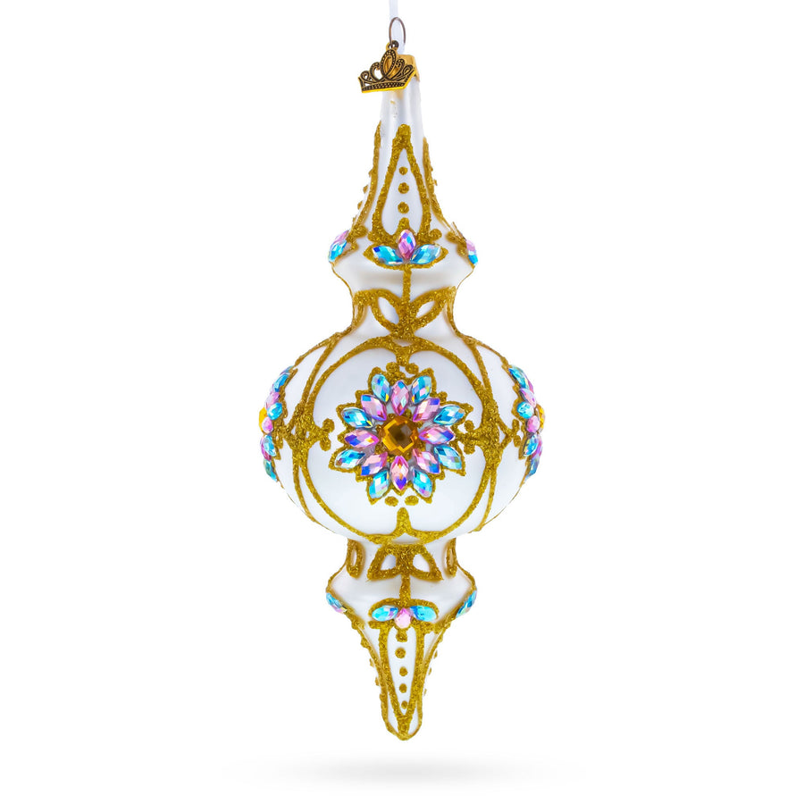 This elegant glass Christmas ornament features a unique globe finial shape with a round center and tapered top and bottom. Embellished with sparkling gemstones, intricate glitter swirls, and ornate detailing, it adds a touch of classic holiday charm to any tree. Hand-painted and crafted with old-world artistry, this festive piece reflects light beautifully, creating a luxurious and eye-catching display. Perfect for collectors or anyone looking to elevate their holiday décor.
