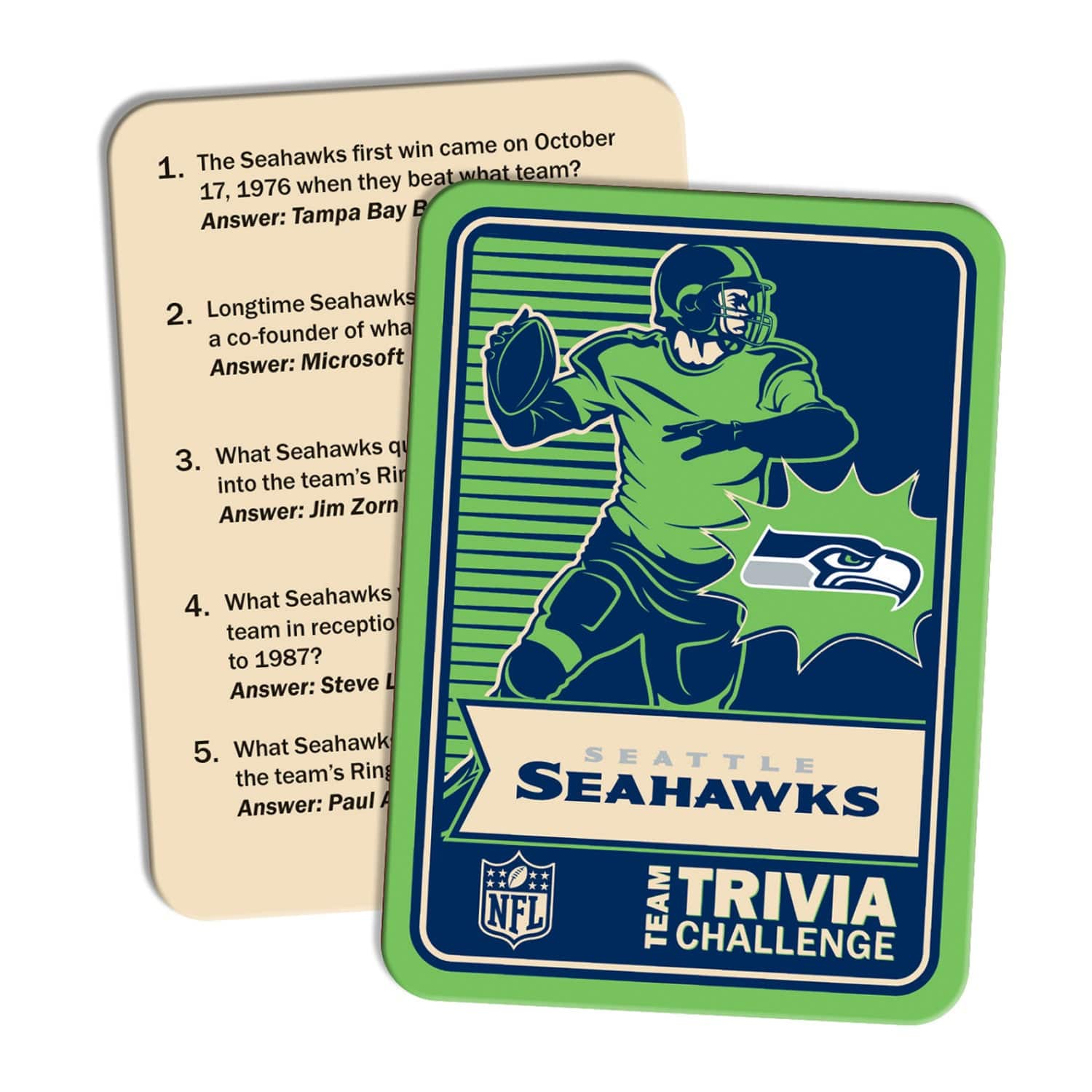 Do you think you know the Seattle Seahawks better than anyone else?  Here's your chance to prove it with the Seattle Seahawks Trivia Challenge.  Each trivia card contains 5 questions about the Seattle Seahawks.  If a player answers a question correctly, they get to keep the card.  The player with the most cards at the end wins.  Includes 50 trivia cards with 250 team-specific questions.  Recommended for ages 12 and up.
