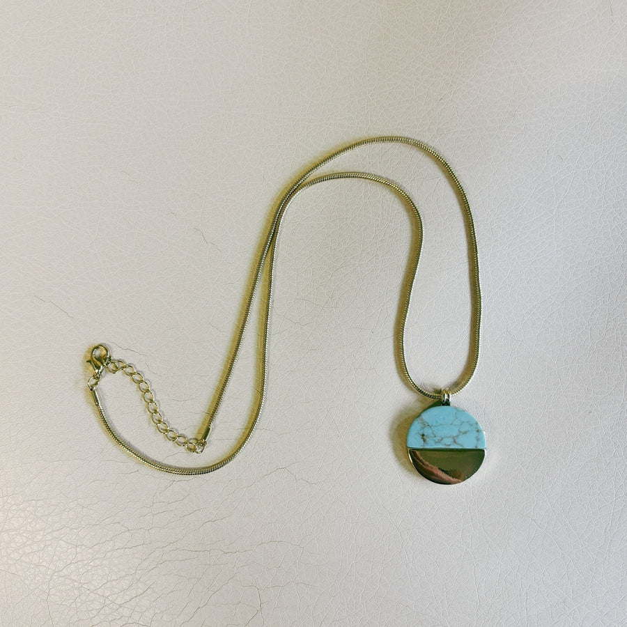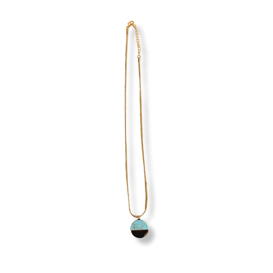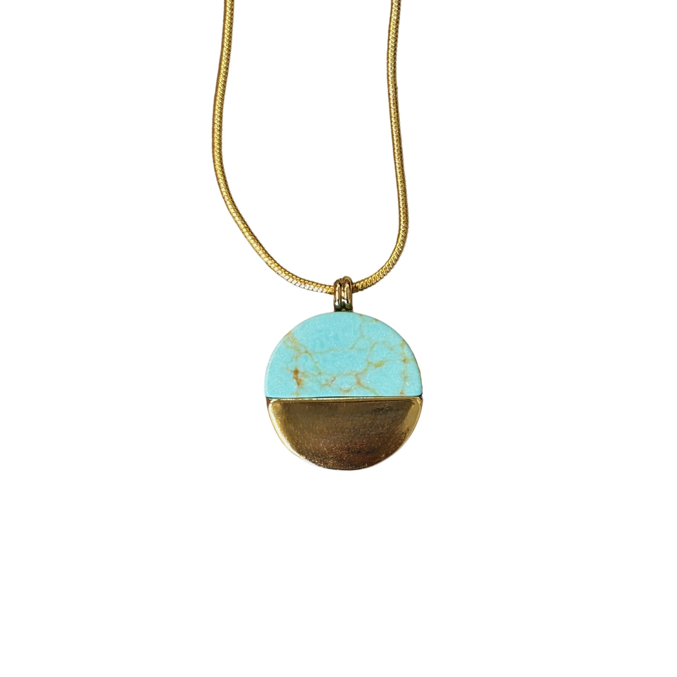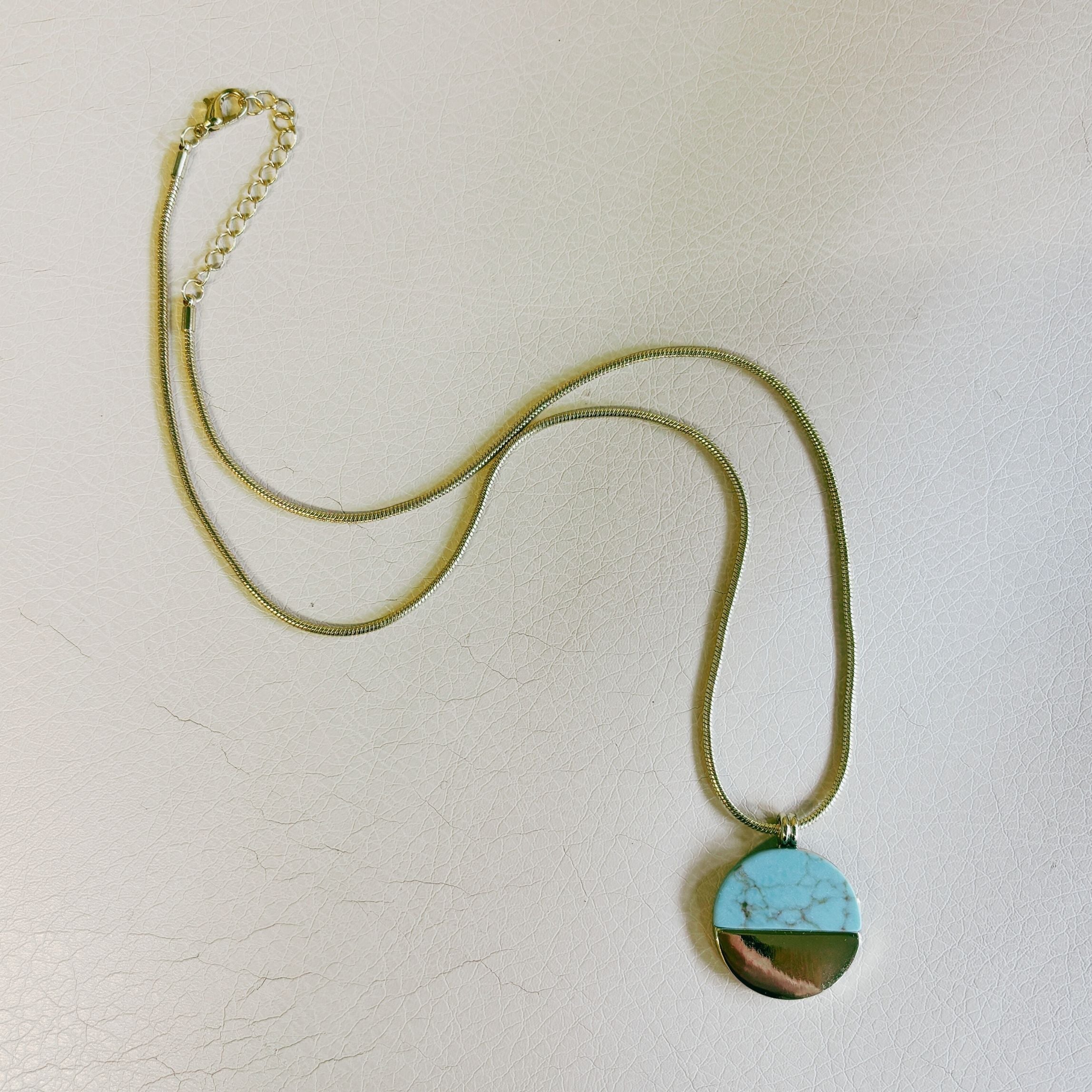Elevate your everyday look with the Turquoise Disc Necklace, a modern yet earthy piece that brings balance and style to any outfit. Featuring a round pendant with a striking half-turquoise, half-metal design, this necklace blends natural stone with sleek shine for a clean, minimalist statement.