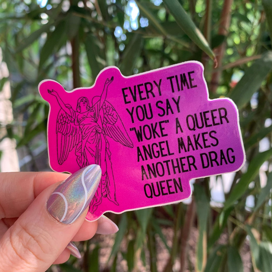 Sticker reads, "Every time you say 'woke' a queer angel makes another drag queen"