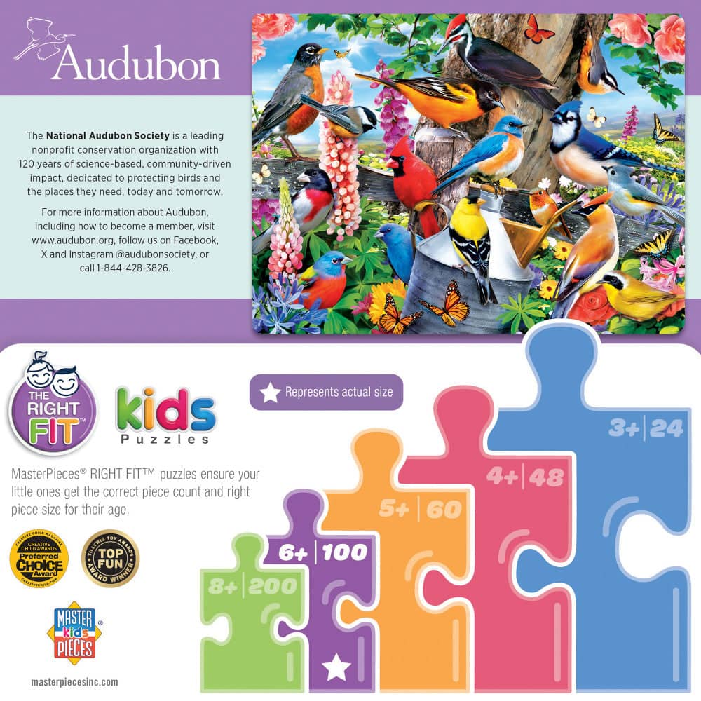 This beautiful 100 piece Audubon kids puzzle is full of colorful beautiful songbirds of North America and sponsored by the National Audubon Society. Its fit right pieces make is easy to put pieces together and add just the right amount of challenge. To reduce its impact on our environment, the chipboard used in this puzzle is made of 100% recycled material.