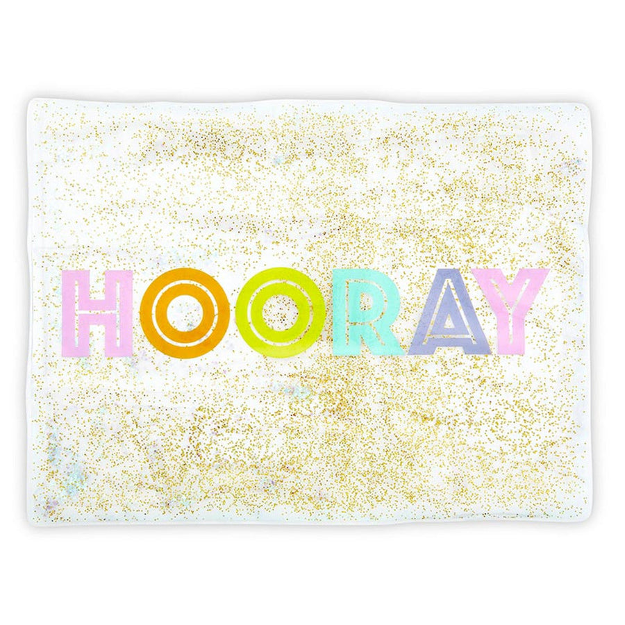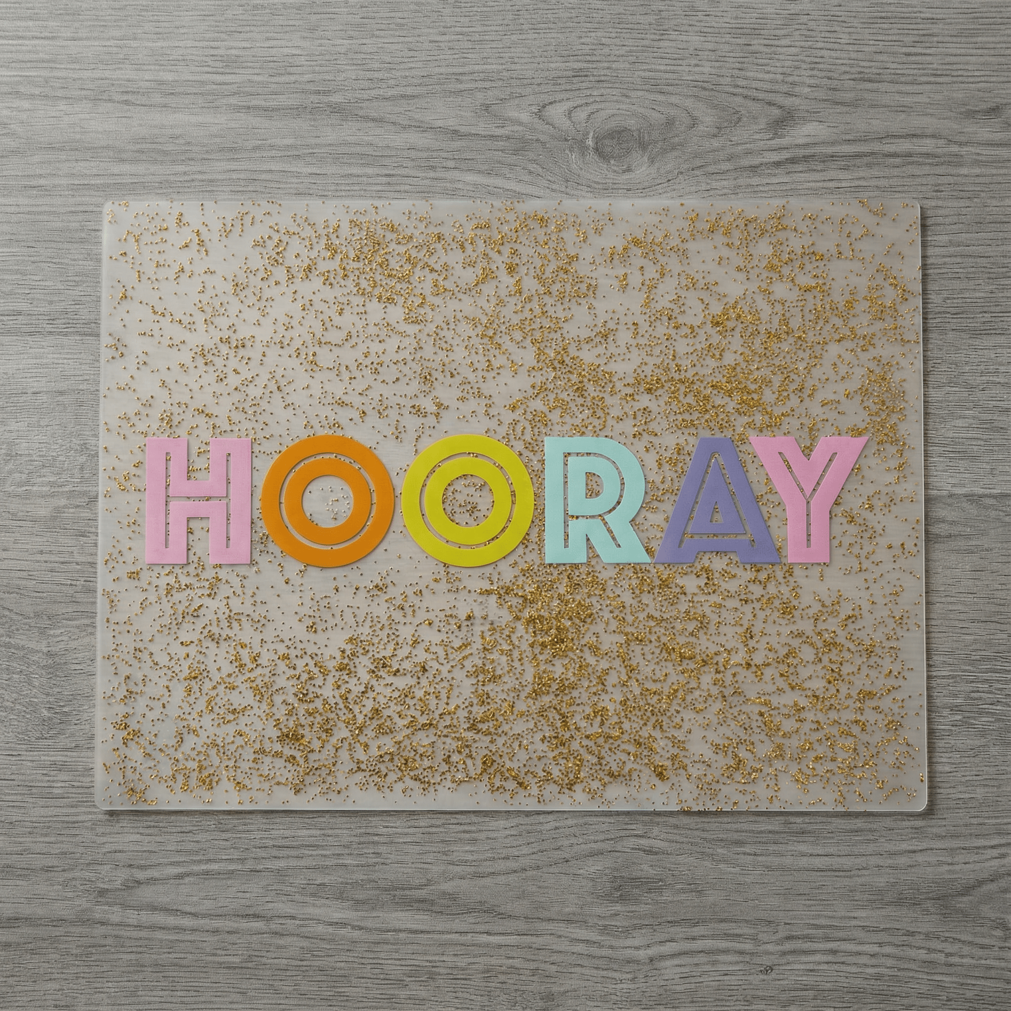 • FUN GLITTER DESIGN; reads "Hooray" in fun, multicolored text