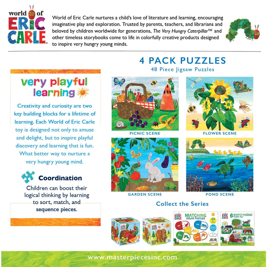 Step into the magical world of Eric Carle with this four-pack puzzle set inspired by his iconic children's book, "The Very Hungry Caterpillar." Each puzzle, consisting of 48 pieces and measuring 10" x 8", depicts a unique scene from the beloved story: a lively picnic, a vibrant flower and bug scene, a peaceful pond image, and a colorful vegetable patch. These puzzles, crafted from thick 100% recycled puzzle board, ensure a tight interlocking fit and offer a fun, challenging experience for kids. Suitable for ages 4 and up, this officially licensed Eric Carle product is sure to provide hours of entertainment and learning, all while promoting hand-eye coordination and problem-solving skills.