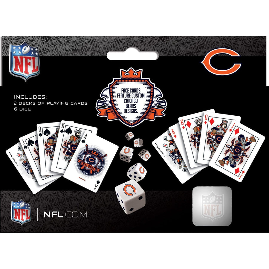 Who says you can't bring the casino to your next game night? These Officially Licensed NFL Chicago Bears 2-pack playing card and dice sets are perfect for any game night. The high-quality Casino Style Cardstock playing cards are perfect for any fan of the Chicago Bears. The deck features a unique team design and comes with a 6-piece 16mm D6 gaming dice set. Whether you're playing some poker or trying to beat the dealer at blackjack, these cards will help you do it in style. So roll the dice and get ready to bet big, because, with this set, you're going to win big. Go Team!