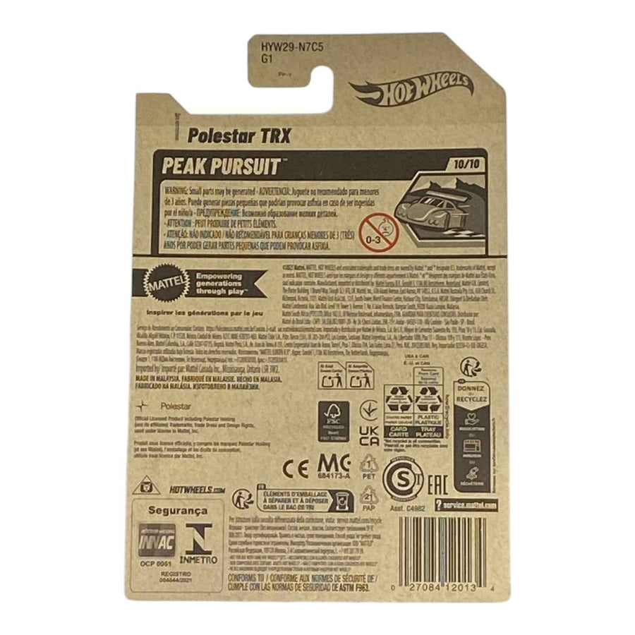 Blast off-road boundaries with the Hot Wheels Polestar TRX from Peak Pursuit Series 10/10 (2025 #HYW29), the groundbreaking 1:64 scale die-cast winner of the 2024 Polestar Design Contest! This metalflake dark gray concept truck, co-designed by Shashank Shekhar and Bryan Benedict, channels T. rex-inspired aggression with exaggerated proportions, sharp LED-style front fascia, massive ground clearance, and rugged off-road stance—Polestar's first-ever Hot Wheels collaboration. Tailored for high-altitude thrills and track conquests, it features low-friction wheels, precise tampo details, and durable metal construction for epic jumps and display dominance. Hunt this new-for-2025 mainline gem in Case Q assortments at Walmart or online—perfect for EV enthusiasts, concept car collectors, and kids craving electric adventure. Search no more for the ultimate Polestar TRX Hot Wheels toy; it's pure speed, style, and collectible fire!