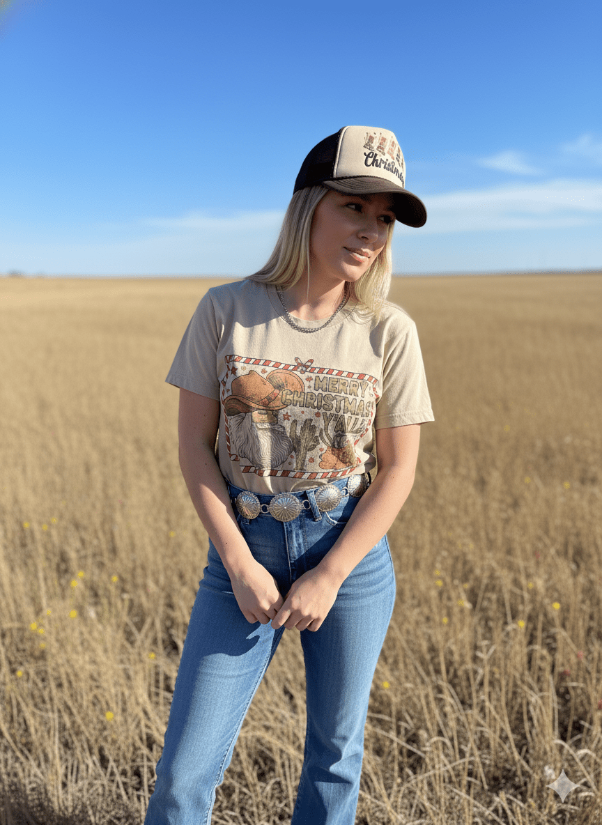 Bring a little Western cheer to the holidays with this Merry Christmas Y’all Graphic Tee. Featuring a playful design of Santa, a cactus, and reindeer, this soft cotton tee mixes festive spirit with desert charm. Perfect for Christmas gatherings, rodeo nights, or cozy days by the fire — it’s holiday fun, cowboy style!