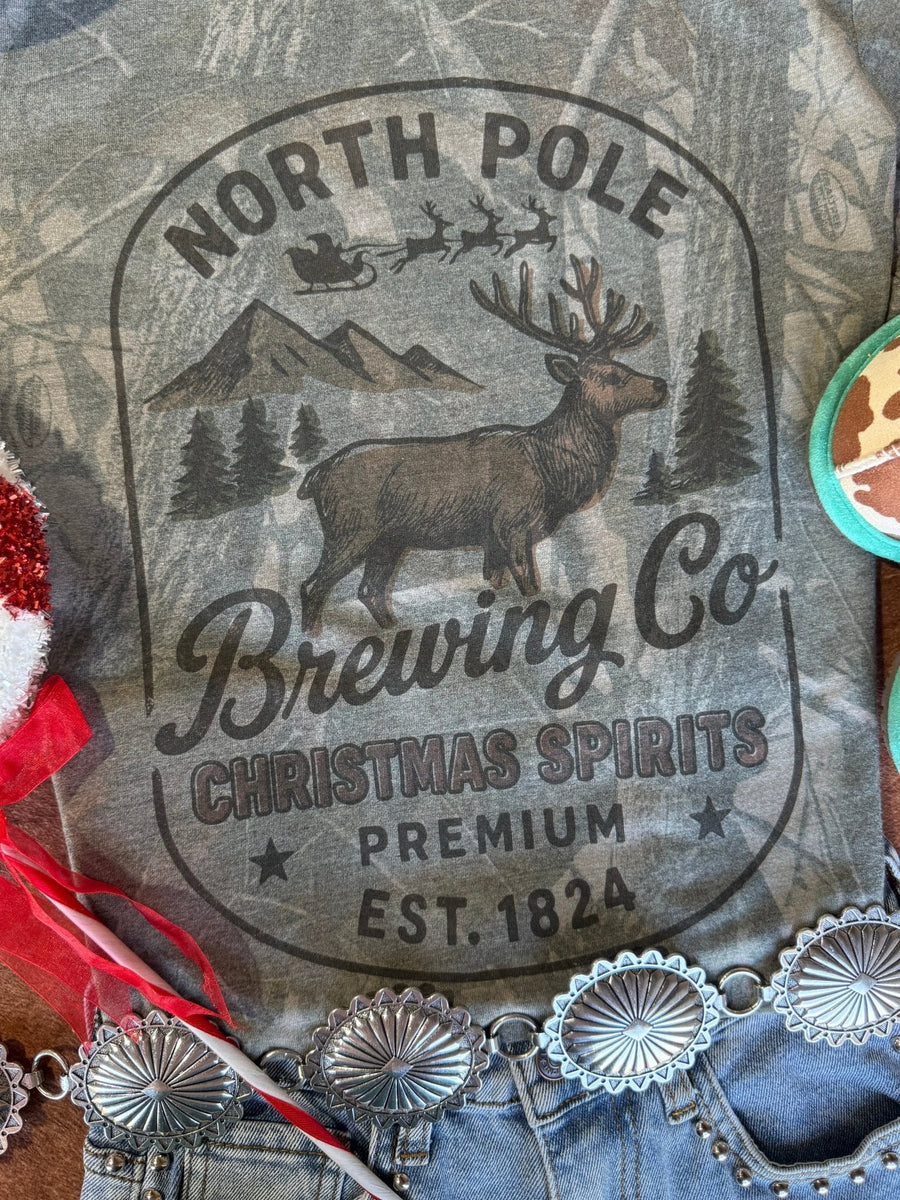 Celebrate the season with rugged holiday style in this North Pole Brewing Co Tree Camo Graphic Tee. Featuring a unique camo tee with Christmas spirits and vintage-inspired lettering, this soft cotton tee blends holiday cheer with outdoorsy charm. Perfect for cozy winter days, holiday gatherings, or kicking back with a cold one by the fire.