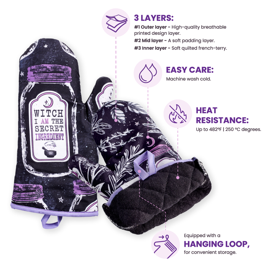 New kitchen witchery must-have item. Premium quality oven mitts, with original gorgeous witchy designs that reads "Witch I am the secret ingredient" printed in witchy tones of black, white, and purple