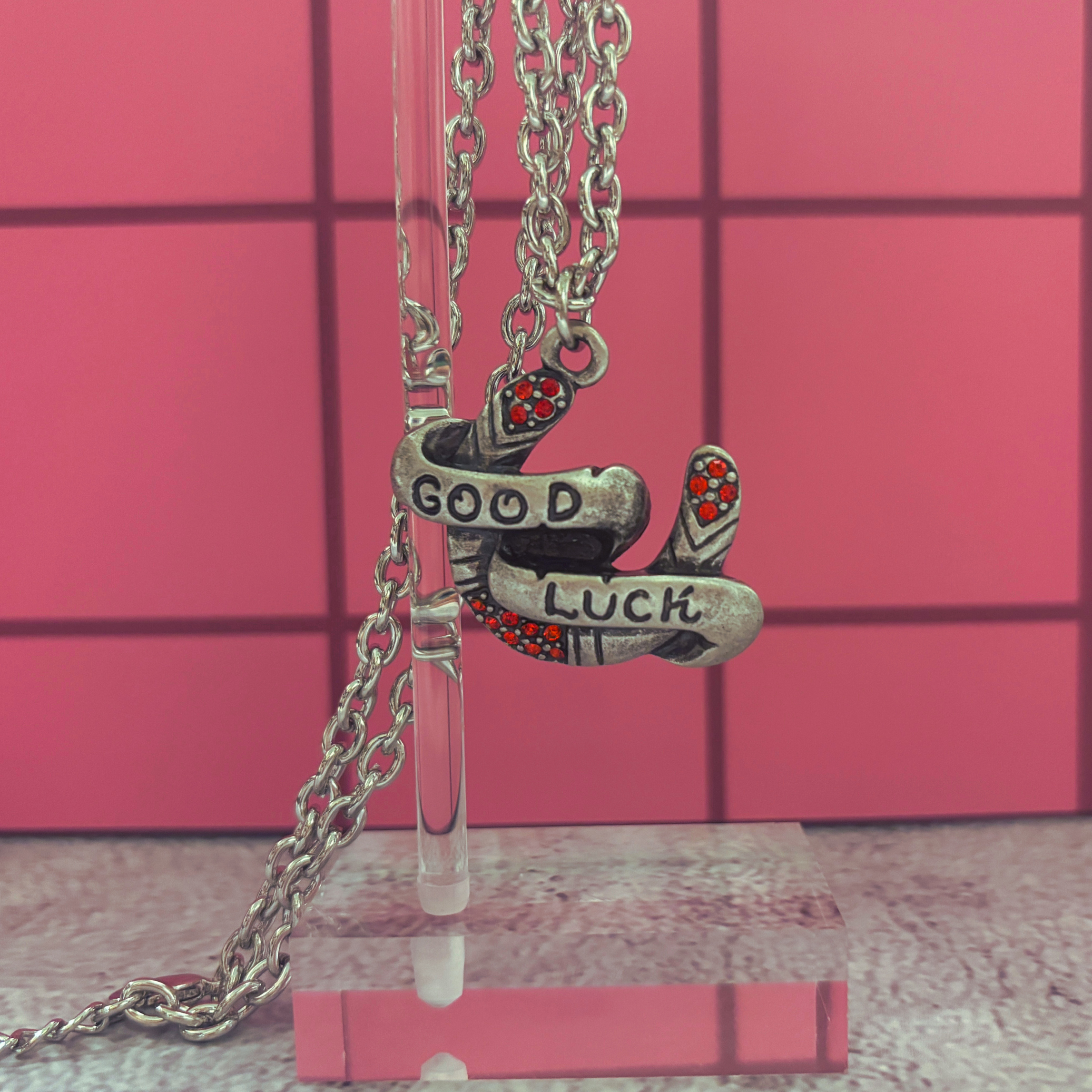 - Tarnished horseshoe charm with “Good Luck” banner