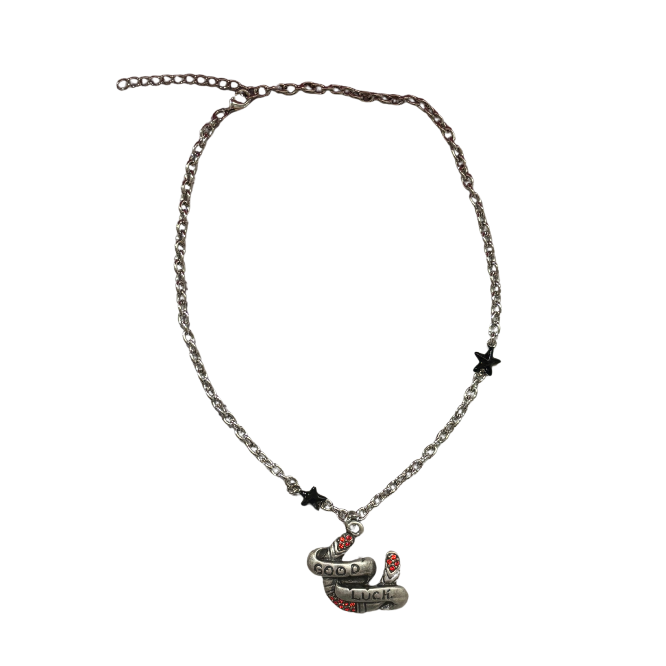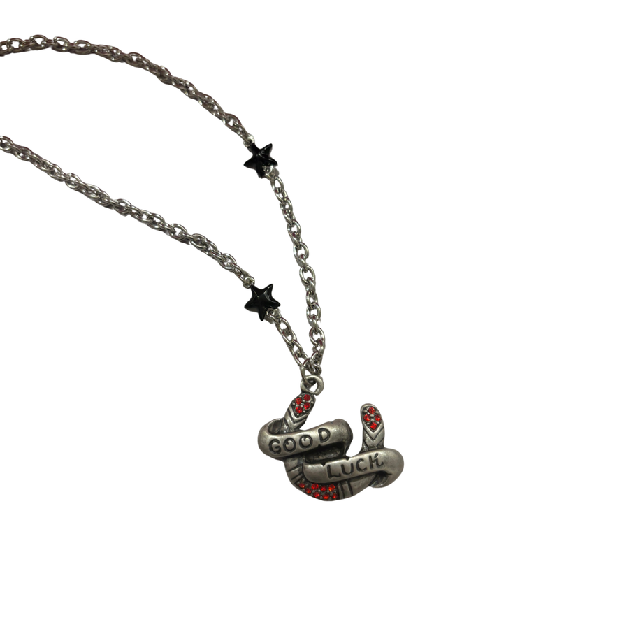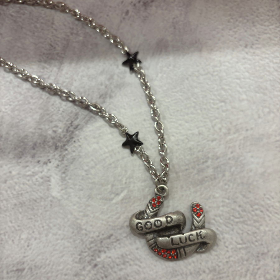 Carry a little luck with you wherever you go with the Sourpuss “Good Luck” Horseshoe Necklace. This tri-charm piece features a tarnished horseshoe charm with a bold Good Luck banner, sparkling red rhinestones, and two striking black star charms. Measuring 1.5" x 1", the horseshoe is just the right size to stand out without overwhelming your look. The necklace hangs from a 16" chain with a 2" extender, making it easy to adjust for the perfect fit.