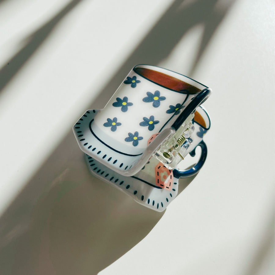 Velvet Claws Mini White Tea Cup with Blue Flowers Hair Claw