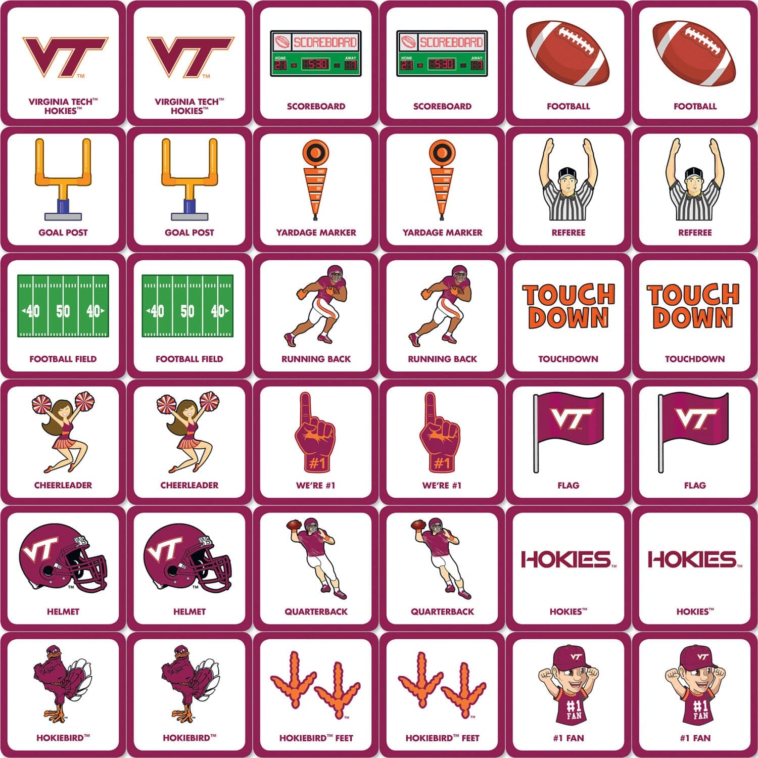 Bring the excitement of college sports home with this officially licensed NCAA matching game featuring the Virginia Tech Hokies. Designed for kids ages 3 and up, this engaging card memory matching game sports 18 unique pairs of symbols from the university, making it a fun and educational choice for family game night or as a toddler board game. The compact size (6.5 x 5.5 x 2.25 inches) makes it easy to take on the go, perfect for travel or playdates. This matching game helps develop memory, concentration, and sports knowledge, making it ideal for young fans and those looking for Virginia Tech merch or apparel gifts. The unisex design and team colors make it a great addition to any collection of college matching games or sports-fan games. Manufactured by MasterPieces, a trusted American puzzle and game company, this product stands out for its quality and satisfaction guarantee. No batteries or assembly required, and it comes in a flat free package for easy storage. Whether you’re shopping for matching games for 5 yr old, looking to complement Virginia Tech baby clothes or a Virginia Tech shirt, or searching for a unique sports-themed gift, this game is a winning choice for any Hokies supporter.