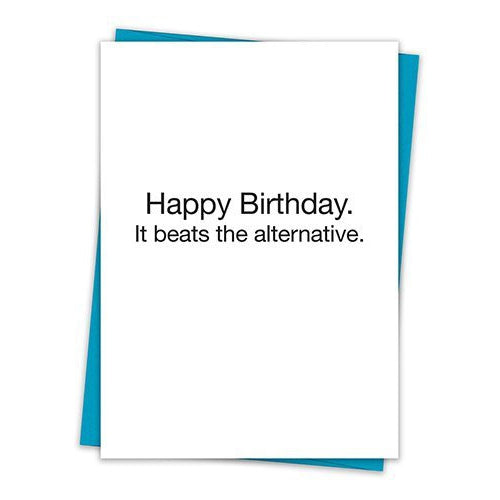 Let someone you love know you're thinking about them by sending this greeting card that reads "Happy Birthday. It Beats The Alternative."