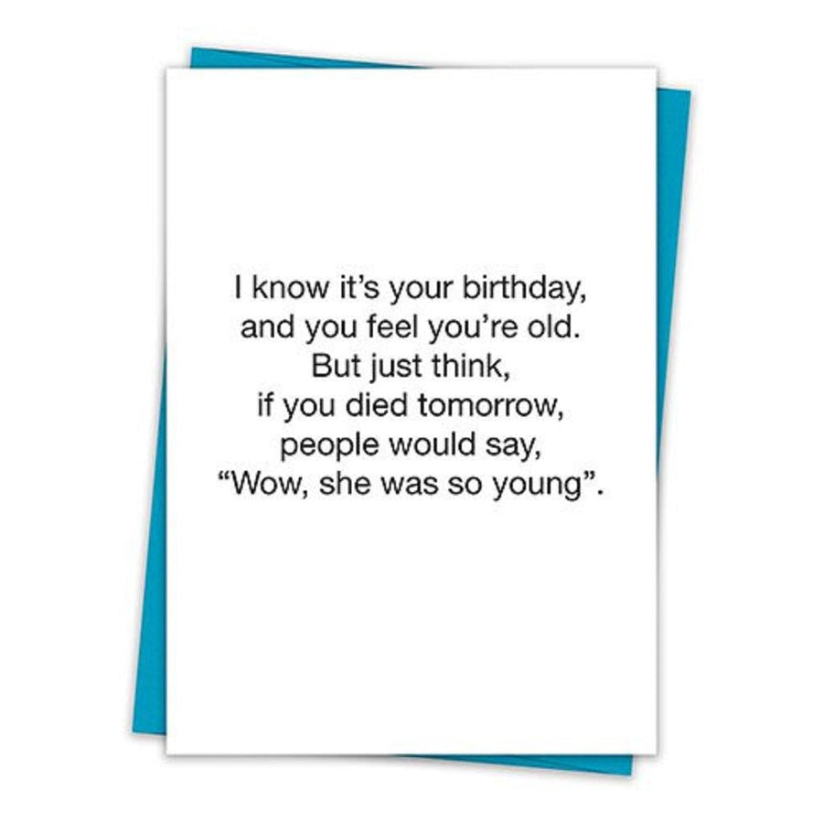 Let someone you love know you're thinking about them by sending this greeting card that reads 'I know it's your birthday, and you feel you're old. But just think, if you died tomorrow, people would say, "Wow, she was so young."'