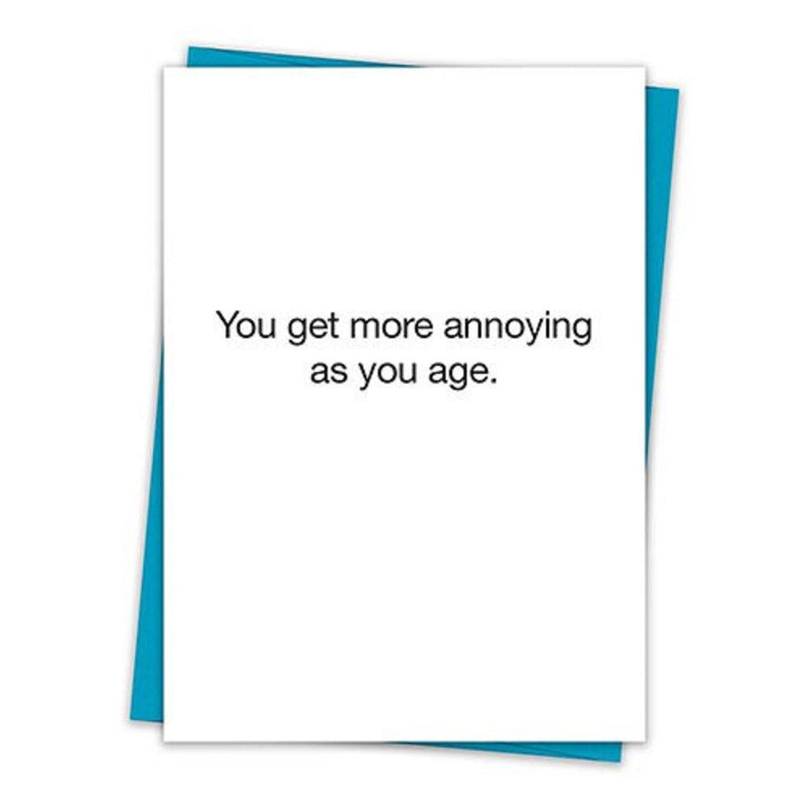 Let someone you love know you're thinking about them by sending this greeting card that reads "You get more annoying as you age."