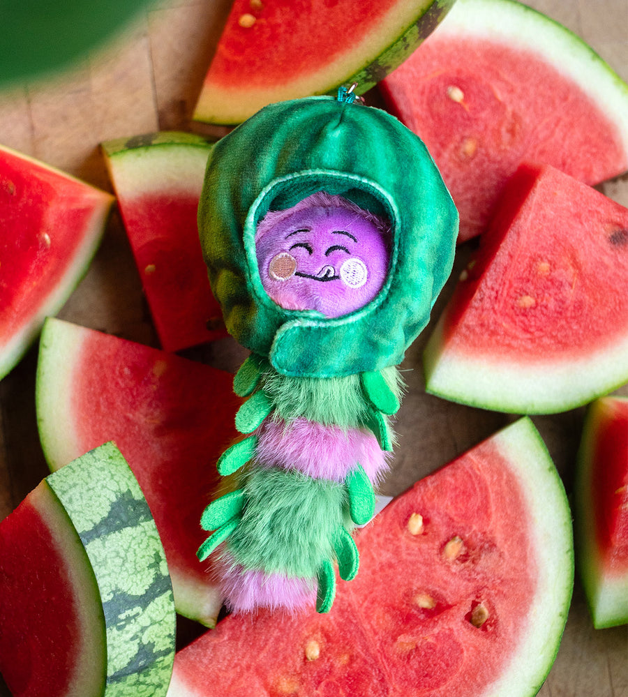 In May, when Wooly Bear and his friends gather, they talk about their plans for the upcoming fall season, munch on fruit and leaves and explore all the little things nature provides them. Each plush keychain figure comes with a removable fruit hat!