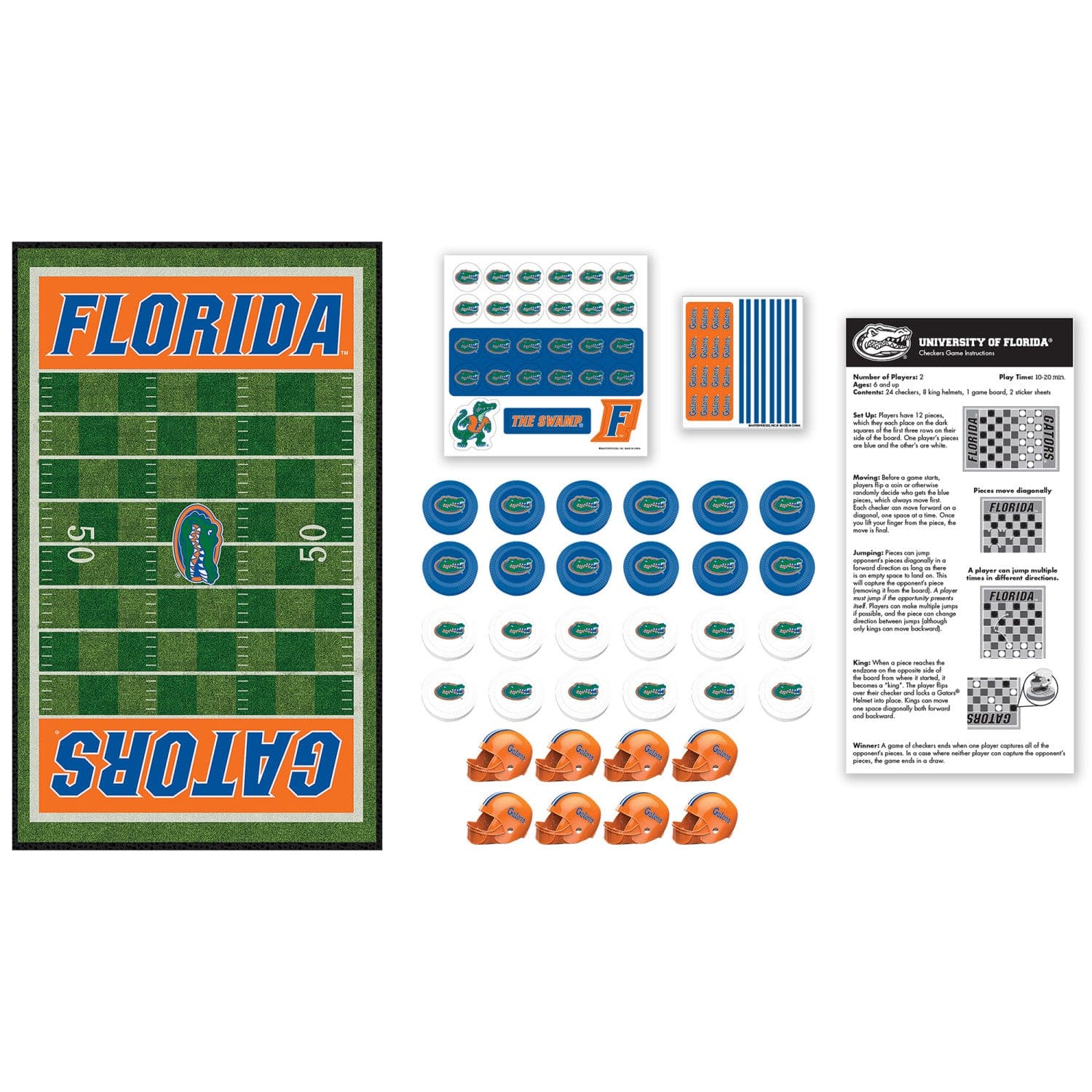 Dive into the excitement of the MasterPieces NCAA Florida Gators Checkers Board Game, a perfect blend of classic checkers and collegiate spirit. This officially licensed product features a 13" x 21" game board designed with team colors and logos, making it a must-have for any Florida Gators fan. The set includes 24 checkers pieces and 8 football helmet king pieces, allowing you to crown your king with a Florida helmet that snaps securely into place. Drive your checkers down the football field on a realistic checkerboard with team color end zones, adding a unique twist to the traditional game. Ideal for ages 6 and up, this game is perfect for family game nights or as a Florida Gators decor piece. Lightweight at just 1 pound, it's easy to transport for tailgating or gatherings. Whether you're a fan of NCAA checkers or looking for a unique gift, this checkers game set offers endless fun and team pride. With its durable plastic material and vibrant design, it's a standout addition to any game collection. Enjoy the thrill of the game and see who will win and wear the crown in this spirited competition.