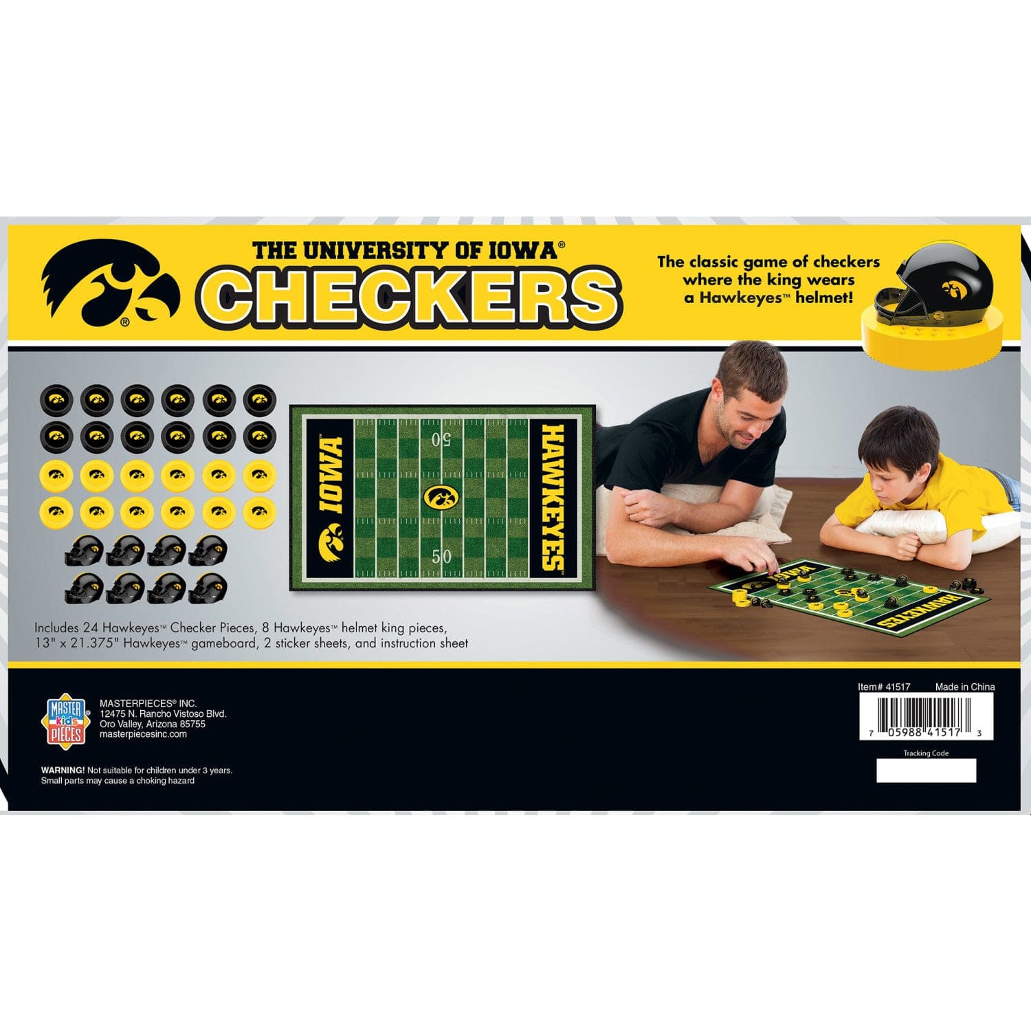 Experience the thrill of the game with the MasterPieces NCAA Iowa Hawkeyes Checkers Board Game. This officially licensed collegiate product is perfect for sports fans and board game enthusiasts alike. The set includes 24 checkers pieces and 8 football helmet king pieces, allowing you to crown your king with an Iowa helmet that snaps securely into place. The 13" x 21" game board features a realistic football field design with team color end zones, bringing the excitement of NCAA football checkers game to your tabletop. Ideal for two players, this checkers board game for kids and adults alike offers educational fun while showcasing your team spirit. Made from durable cardboard, the game is lightweight at just 1.1 pounds, making it easy to transport and store. The package includes a sticker sheet and instruction sheet, ensuring you have everything you need to start playing right away. With no assembly required and no batteries needed, this Iowa Hawkeye checkers set is ready for action. Whether you're a fan of the Iowa Hawkeyes or simply love a good checkers game set, this product is a must-have addition to your collection.