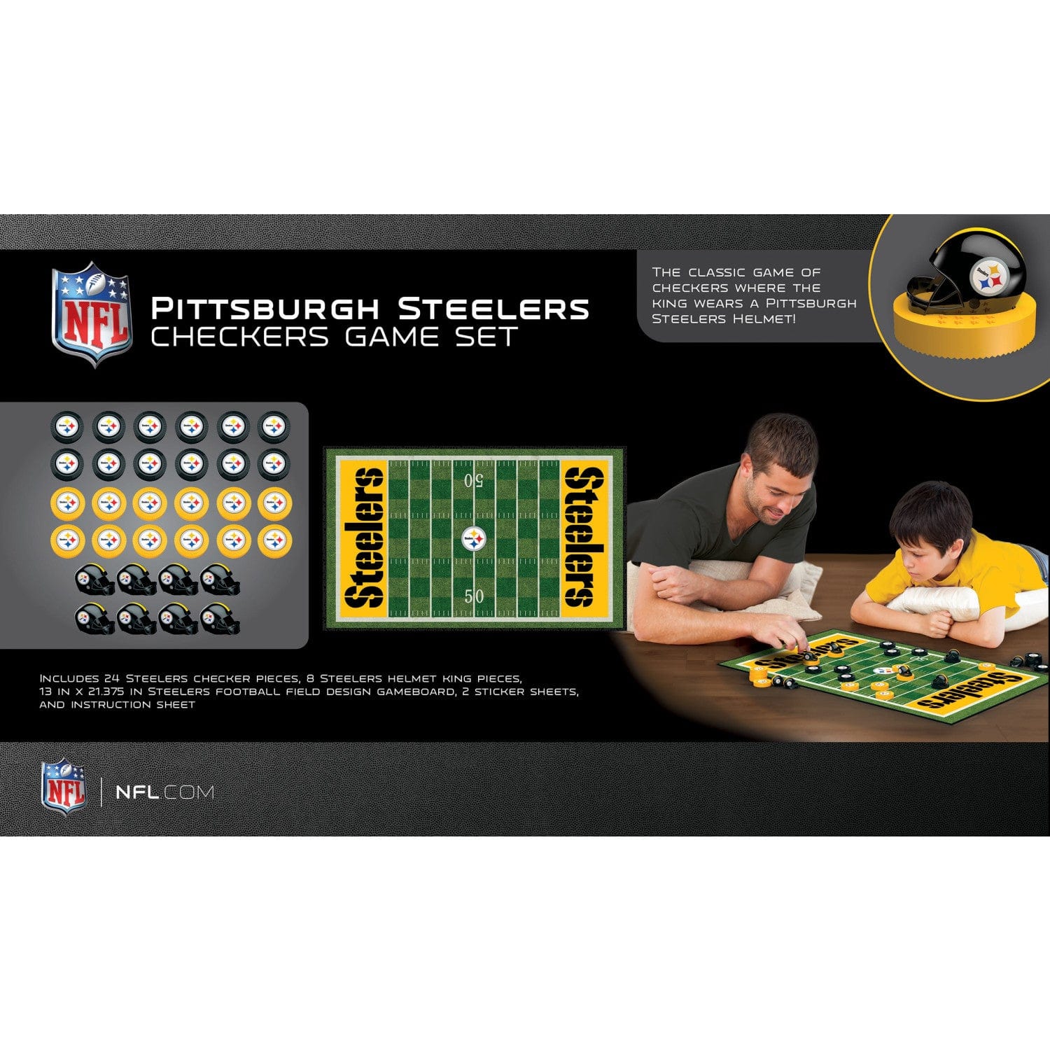Bring the excitement of game day to your home with this officially licensed NFL Pittsburgh Steelers checkers board game, perfect for fans seeking unique Pittsburgh Steelers gifts for men or anyone who loves a themed checkers board game. The set includes 24 checkers pieces, 8 football helmet king pieces, a 13 x 21 inch game board with vibrant team color end zones, a sticker sheet, and instructions. Each king checker is crowned with a Steelers helmet that snaps securely into place, adding a fun twist to the classic steelers checker game set. Crafted from durable cardboard, this Steelers board game is designed for both kids and adults, making it a great addition to family game night or your collection of Pittsburgh Steelers board games. The realistic football field checkerboard enhances the playing experience, while the compact design makes it easy to store or take on the go. With no assembly required and no batteries needed, this steelers checkers game is ready to play right out of the box. Ideal for fans looking for a Pittsburgh Steelers checker set or NFL checkers board game, this product is a must-have for any Steelers enthusiast. Warning: Choking hazard – small parts, not for children under 3 years.