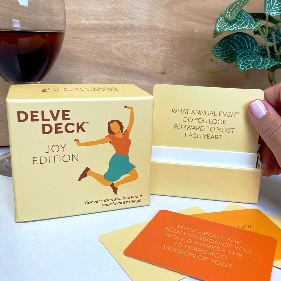 Brighten up your conversations with the Delve Deck Conversation Cards - Joy Edition, crafted to bring out the warmth and gratitude in every chat. This special edition features 150 cards, each a beacon of positivity, designed to elevate your discussions from casual catch-ups to deeply meaningful connections. With three levels of intensity, color-coded for your convenience, you can navigate through light-hearted banter, engaging stories, or profound reflections on joy and gratitude. Whether you're looking to break the ice with someone new or deepen bonds with your dearest friends, these cards offer a spectrum of prompts to cultivate joy and thankfulness in every interaction. The compact and beautifully designed box makes it easy to carry a little sunshine wherever you go, ensuring that every conversation has a silver lining.