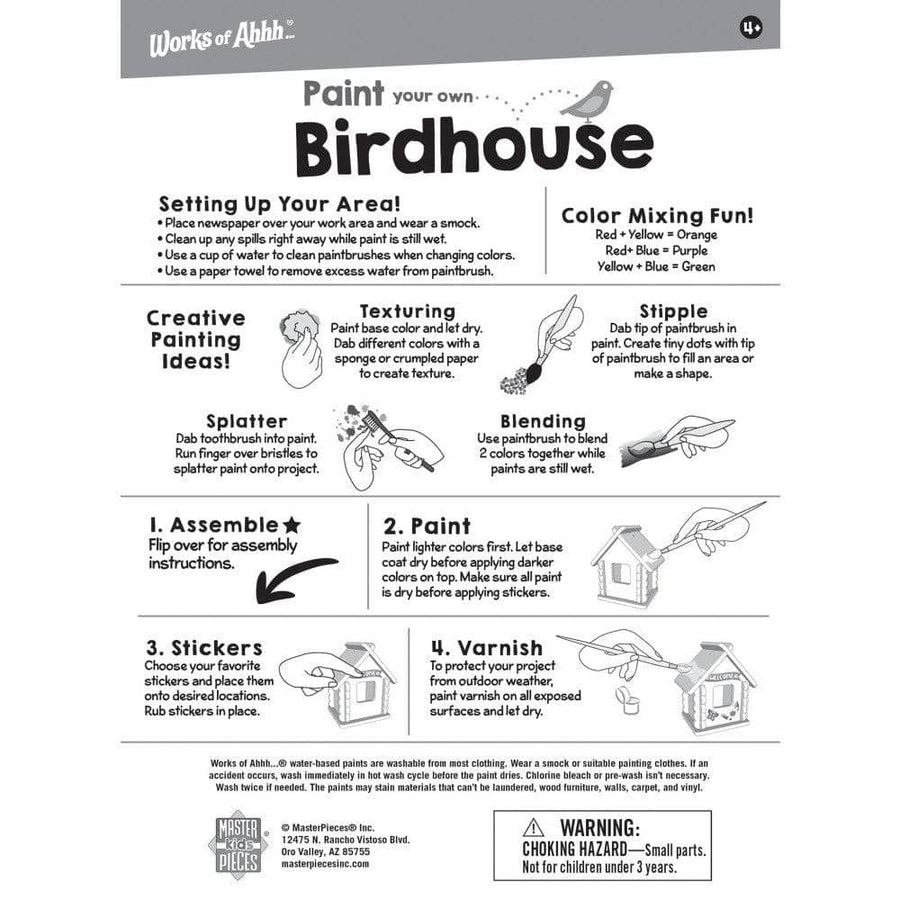 This Birdhouse Buildable Wood Craft & Paint Kit is made of real wood, and includes everything you need to create a beautiful work of art! The Birdhouse Wood Craft & Paint Kit is the perfect gift for every art loving kid! It includes 1 unassembled wood birdhouse, 1 sticker sheet, 1 non-toxic varnish, 4 non-toxic acrylic paint tubs, 1 artist-quality paintbrush, and 1 instruction sheet with painting and building guide.