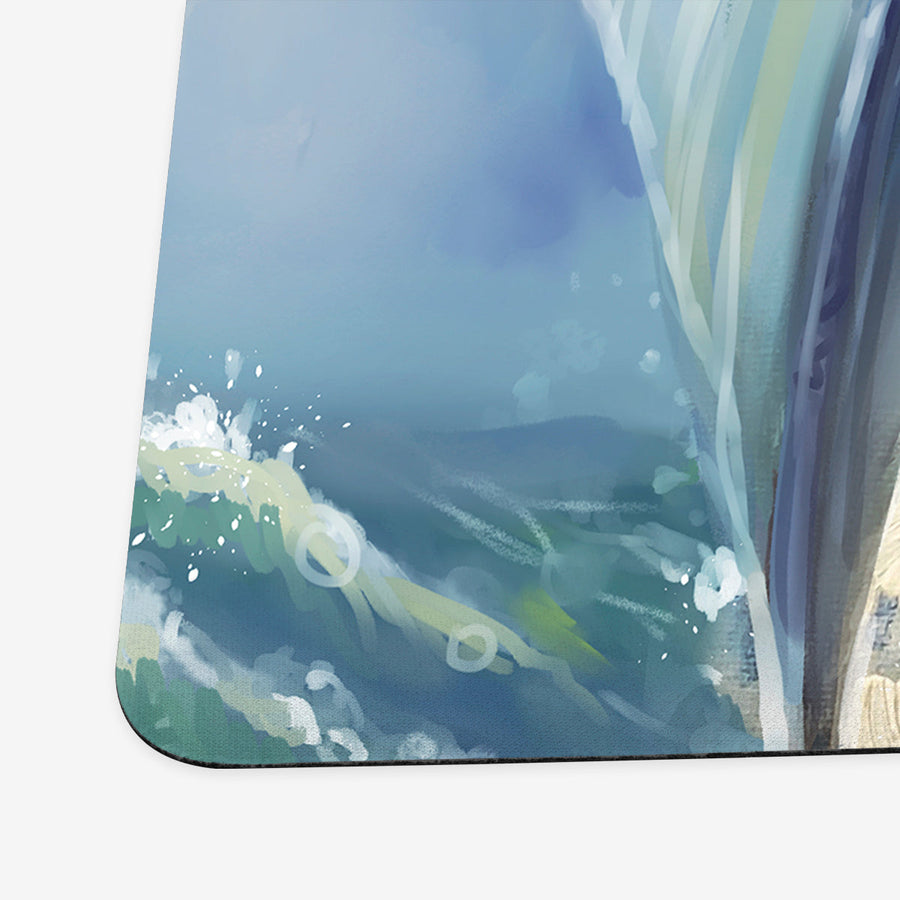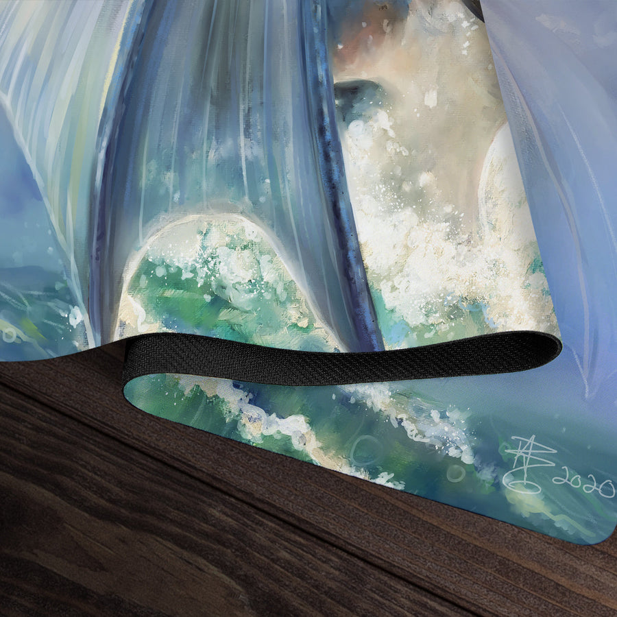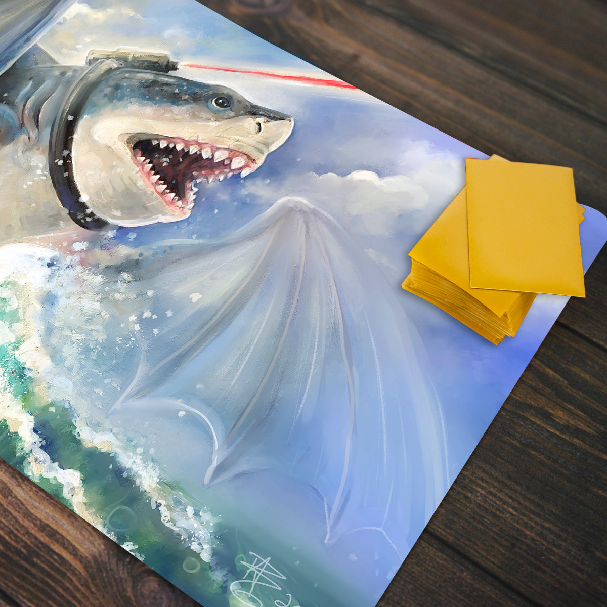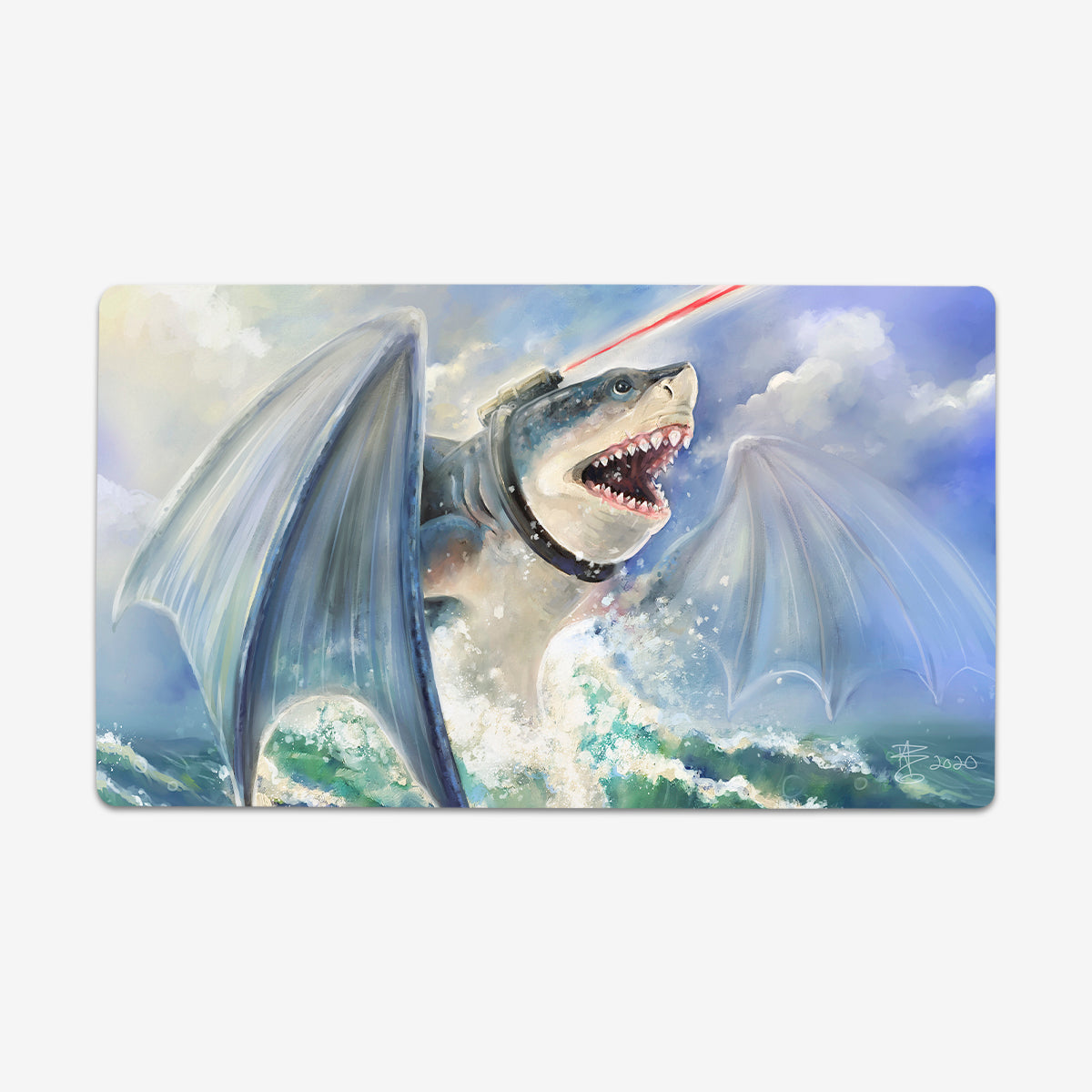 Dive into gaming fun with the jaw-dropping Flying Laser Shark playmat by Kate Becker! Unleash your inner card shark with this unique and handcrafted TCG playmat. It's smooth and soft, ensuring easy card movements while keeping them in top-notch condition. The strong rubber backing guarantees a tight grip on any surface, so no more slip-ups during intense duels. Plus, you can upgrade to a stitched edging for a fray-free and stunning look. Level up your game with this ‘fin’tastic playmat – perfect for MTG, Yu-Gi-Oh!, and Pokémon battles!