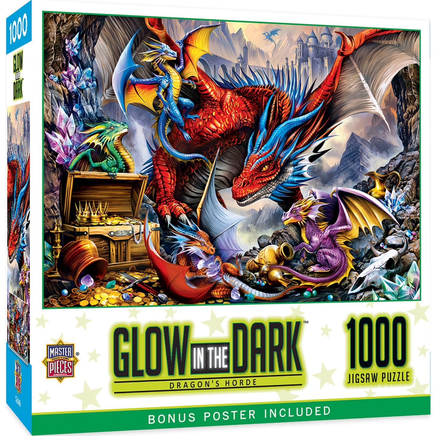 Prepare to enter a world where myth becomes reality with the MasterPieces 1000 Piece Glow in The Dark Puzzle for Adults and Family - Dragon's Horde. This captivating jigsaw puzzle, designed for adults, features 1000 intricately crafted pieces that will capture your imagination and transport you to a land filled with majestic dragons. Perfect for those who enjoy puzzles for adults 1000 pieces, this puzzle offers a unique glow-in-the-dark feature. Turn off the lights and watch in awe as the dragons come to life, their fiery breath illuminating your room with an otherworldly radiance. This luminescent spectacle adds a whole new dimension to your puzzling experience, making it an ideal project for family game nights, solo relaxation, or as an entrancing gift for the dragon lover in your life. The puzzle measures 19.25 inches by 26.75 inches when completed, and its thick recycled puzzle board and random cut pieces ensure a tight interlocking fit, creating a fun and challenging experience. Proudly made by MasterPieces, an American Puzzle & Game Company, this puzzle is designed for unisex adults and is suitable for ages 12 and up. Whether you're a fan of 1000 piece landscape puzzles or seeking a unique addition to your collection of adult puzzles 1000 pieces, the Dragon's Horde Puzzle is sure to delight and entertain.
